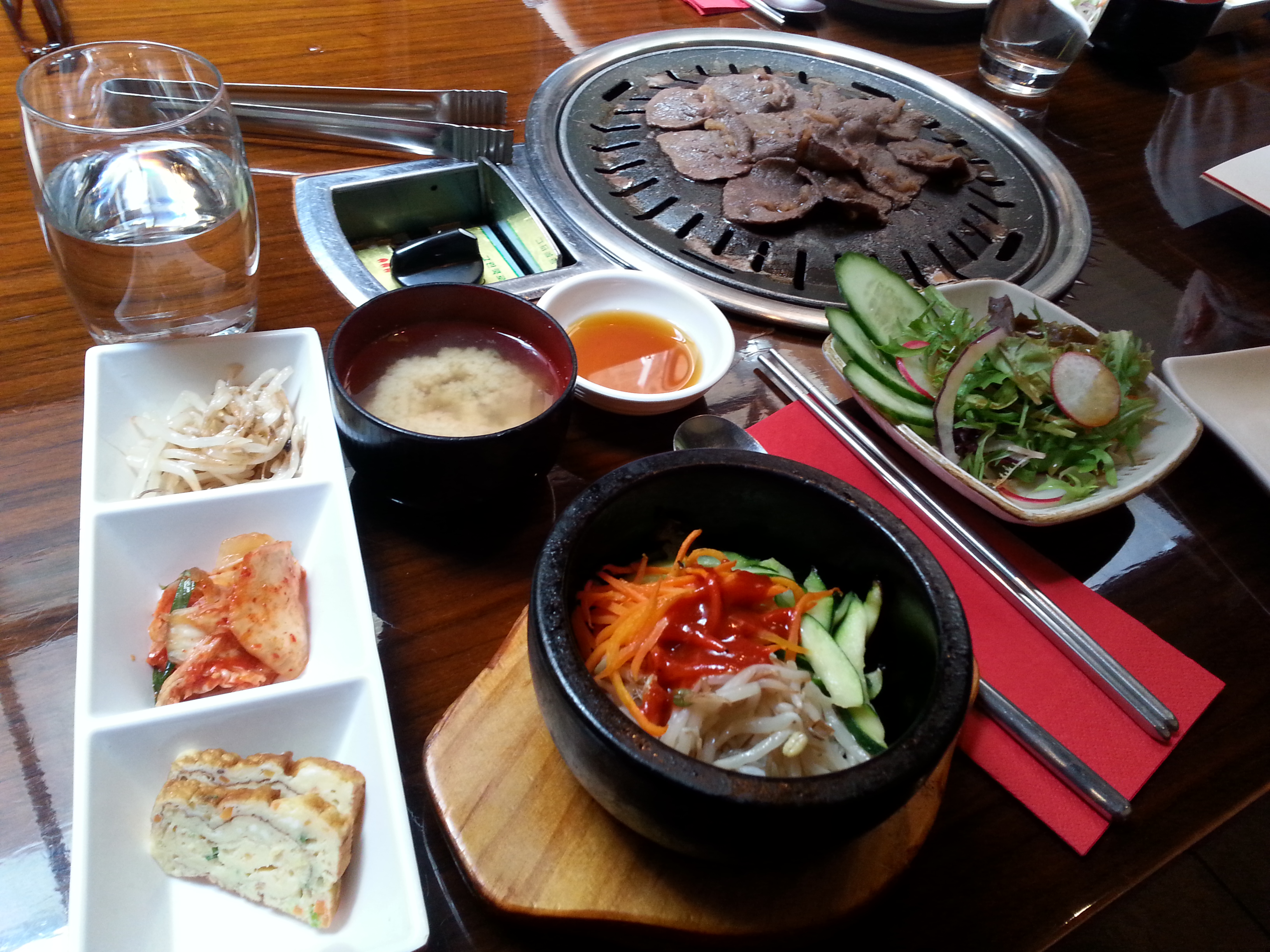 their specialty seems to be their barbequed meats and so it was the “beef lunch barbeque” that I opted for. it came with a side dish with the usual mixed korean appetisers, soup, salad, a baby bowl of bibimbap (it was REALLY baby-sized; more on this later) and meat to be barbequed; there was plenty to eat and i was a very happy bunny.