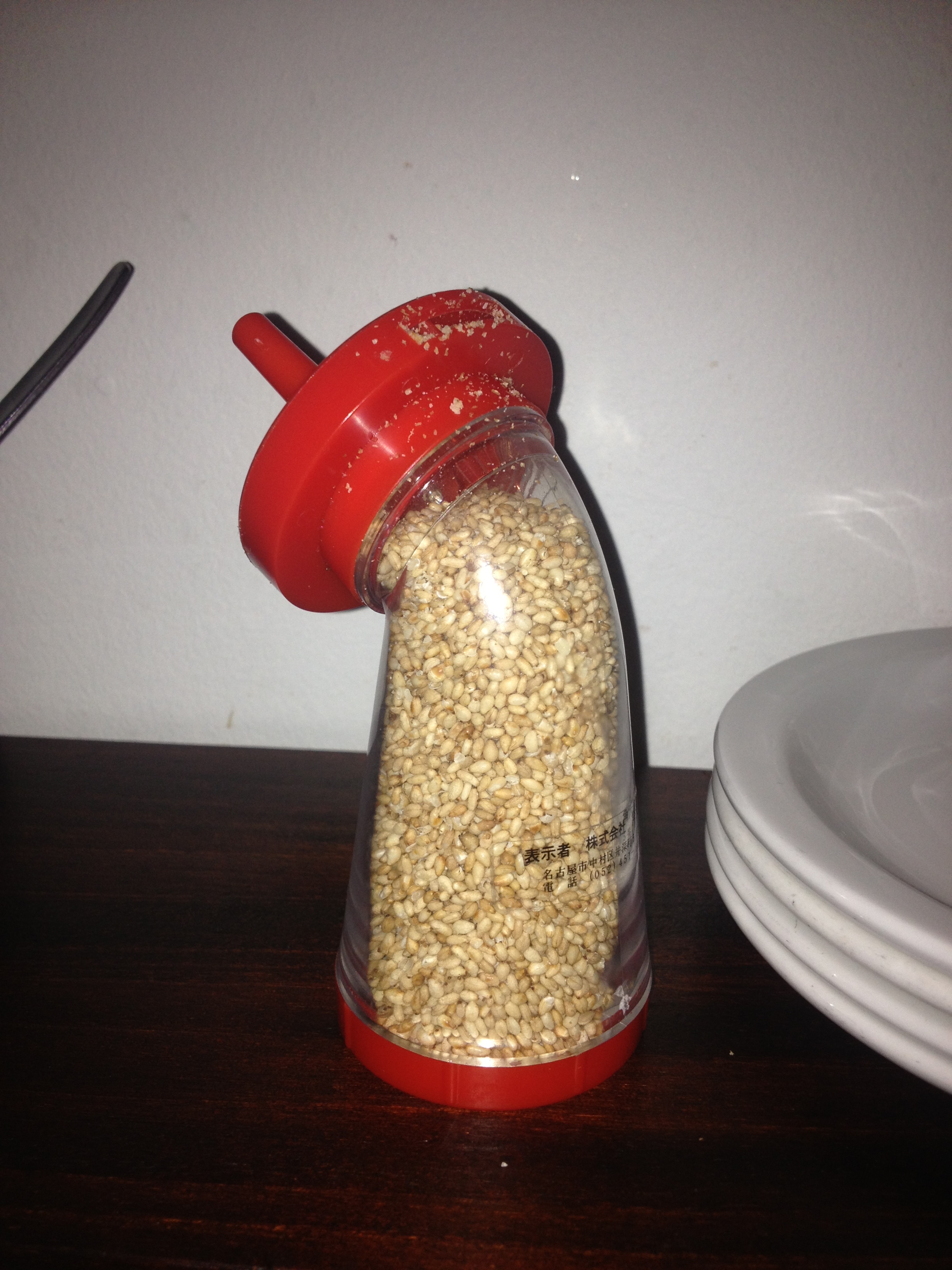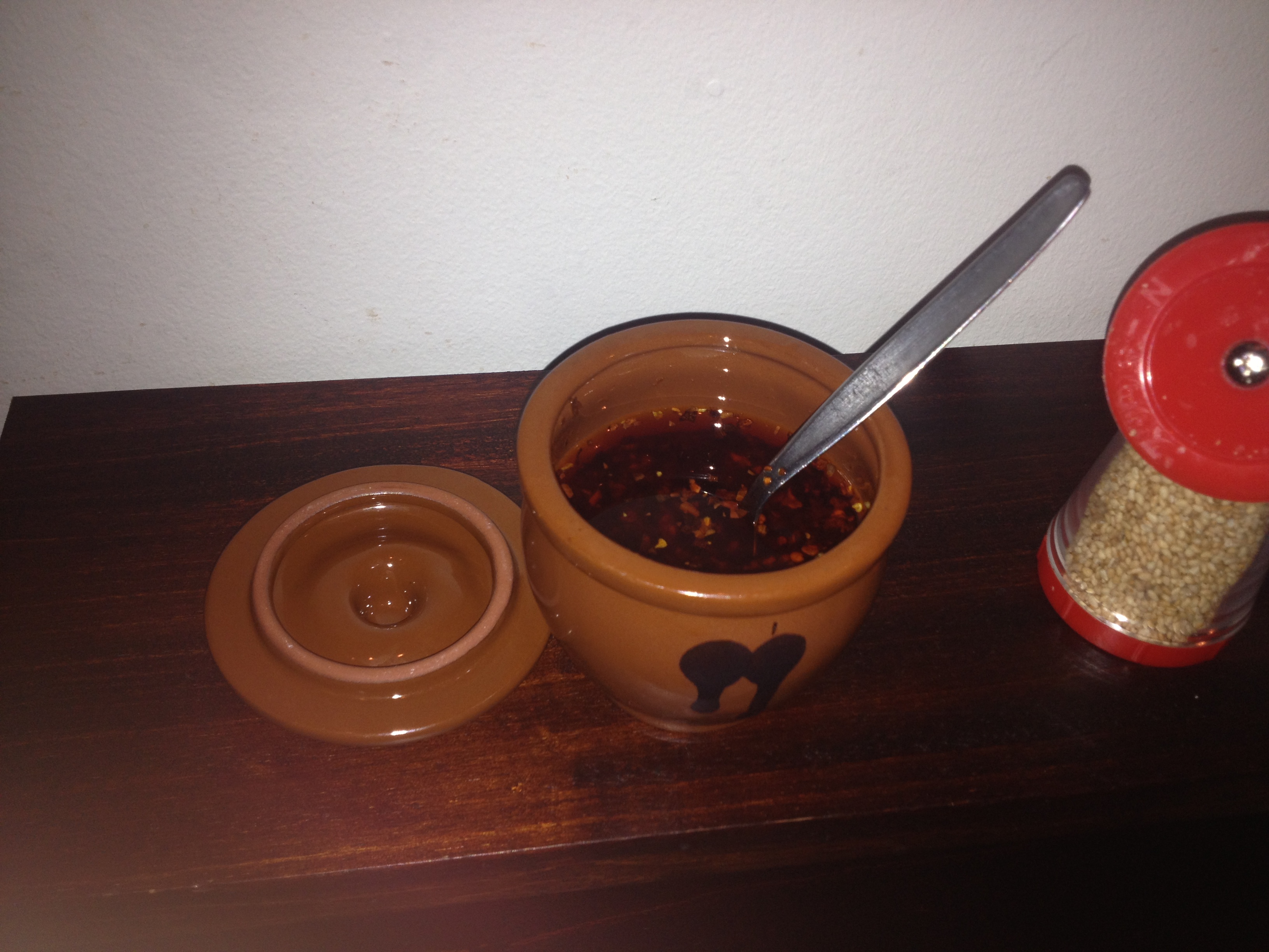 After 15358230231051 years, we were led to our seats. First thing I noticed was that the layout of the tables was pretty cool. They had chilli oil, sesame seeds, chopsticks and this interesting garlic masher.