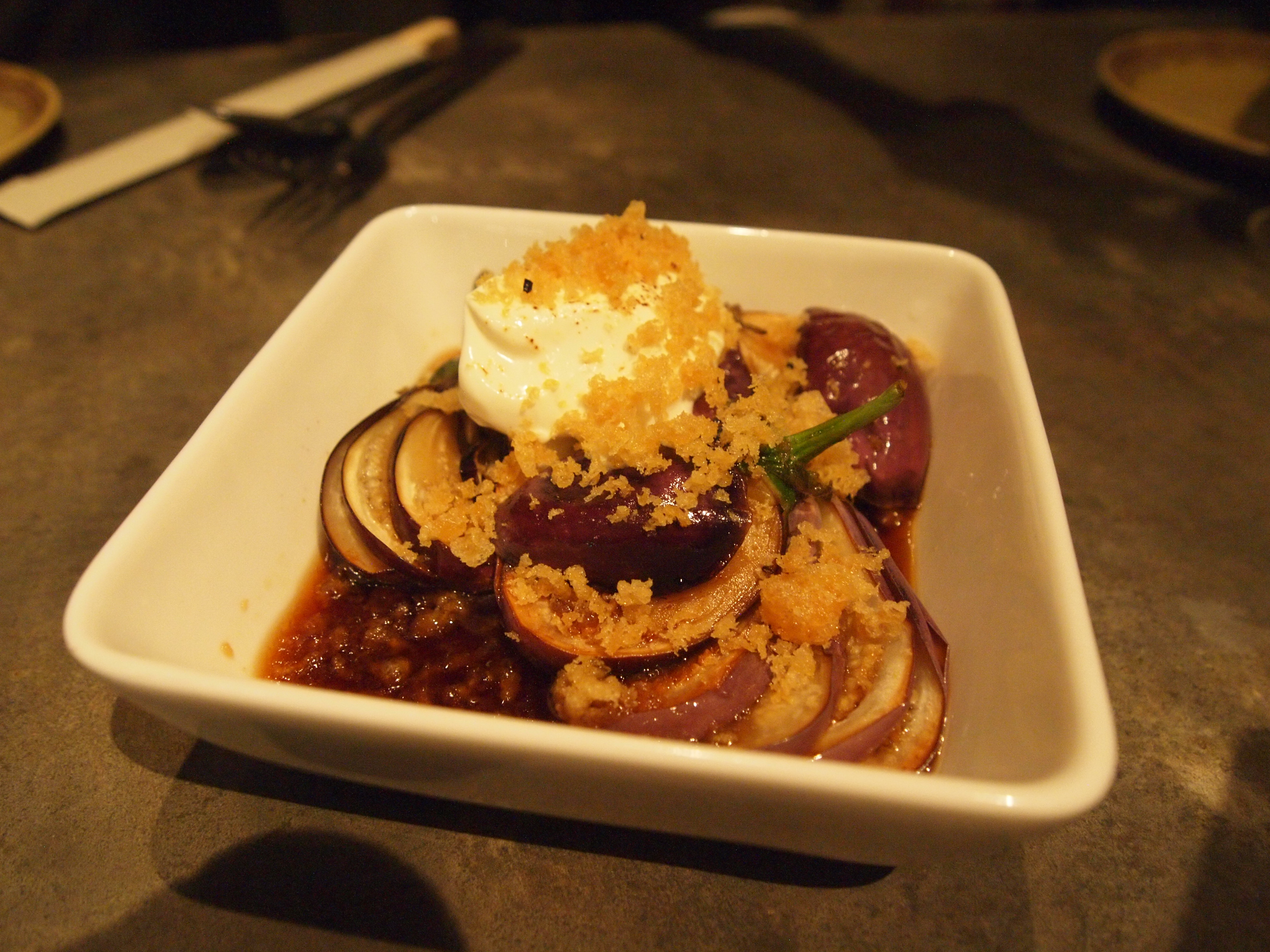 baby eggplant in donburi sauce, with marscapone cheese & tempura flakes – $12