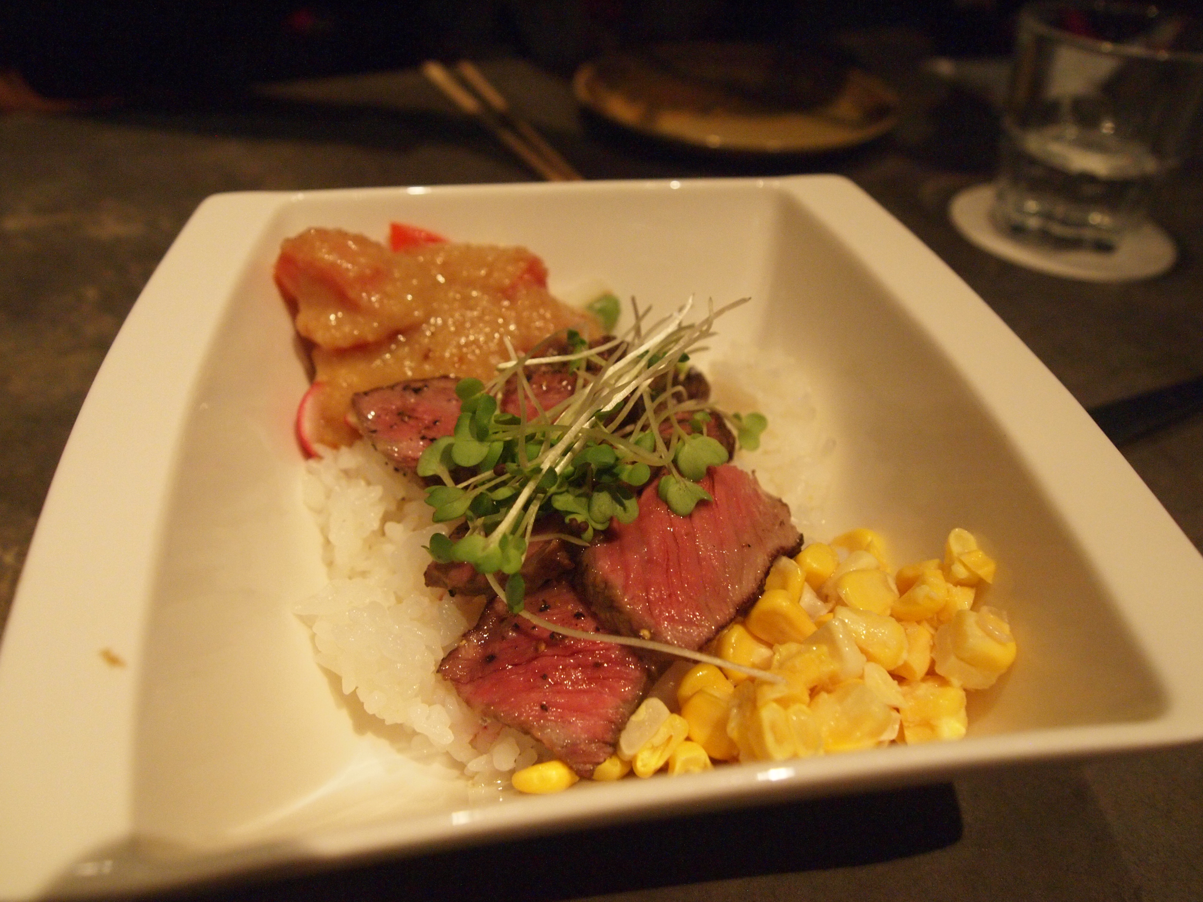 beef short ribs rice bowl (all rice bowls come with nigata rice, sweet corn, radish, sugar peas & wasabi sprouts) – $17