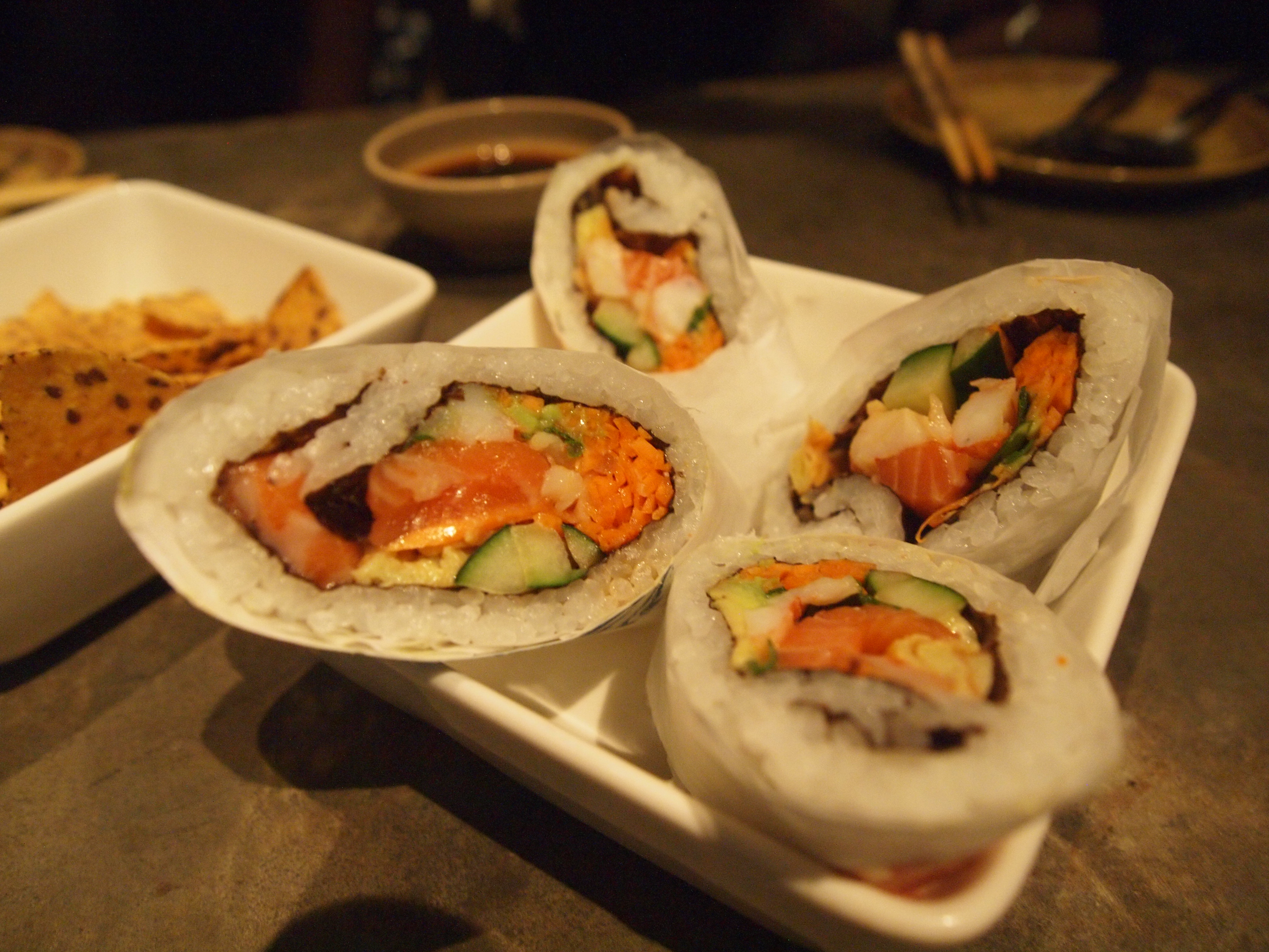 the sushiro was like a giant maki, which they very kindly cut into 4 so that we could share it easily. this was the last dish to arrive at our table, and the one that i felt was the most disappointing. it was rather average and i thought there was nothing that set it apart from regular sushi rolls! although i liked the fact that it was packed with ingredients, i would have preferred the rice to be less compact; it was almost like a huge mass of rice. the sushiro was accompanied by a side of soy flaxseed chips, which were nice, but i didn’t (and still don’t) really see how they complemented the sushiro. doubt i’ll order this again – it is filling and i feel that there are other more interesting things on the menu to be tried.