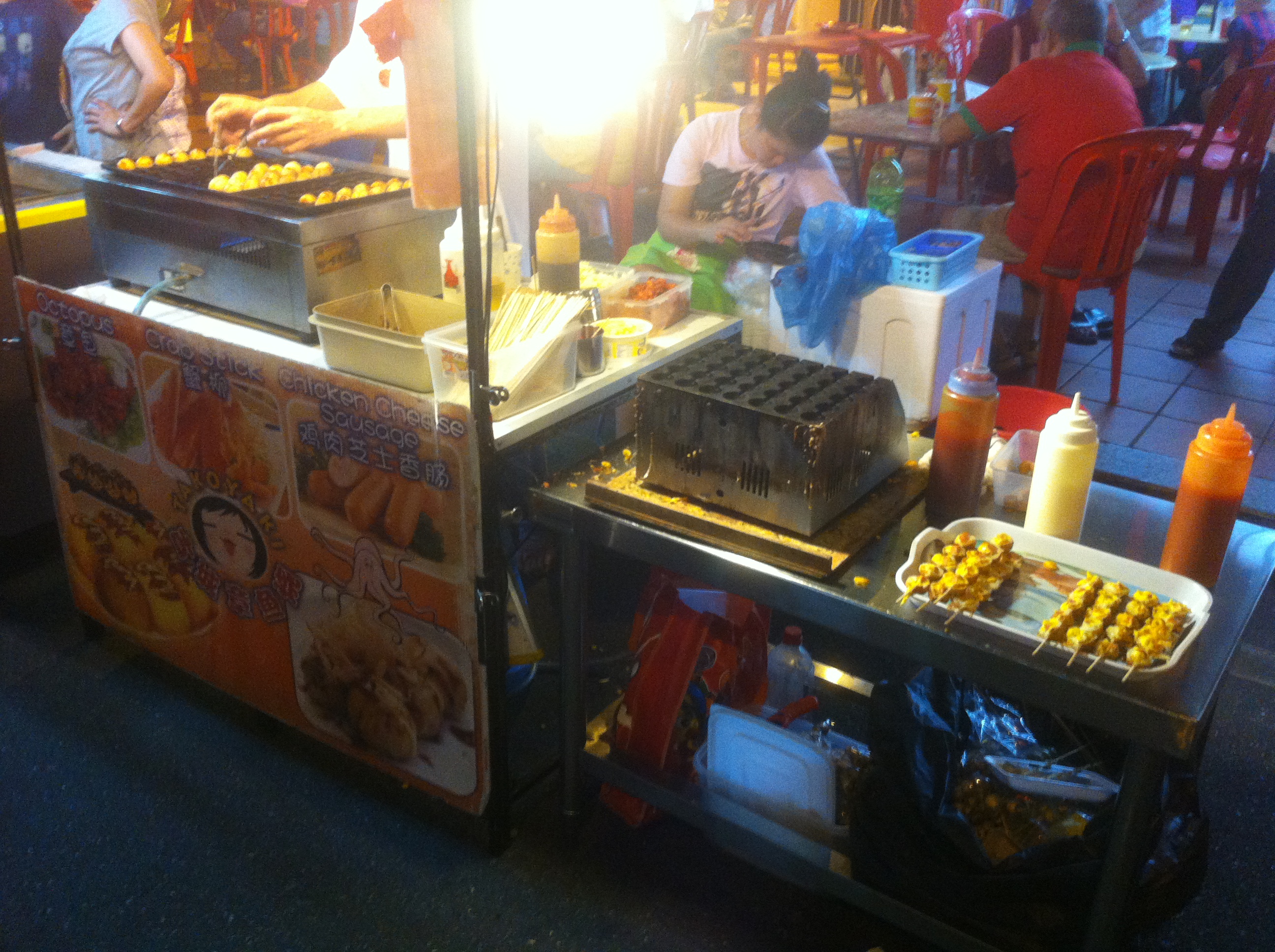 I have always felt takoyaki should be a staple in street markets, given how light a snack and how universally palatable they are. I mean if you don’t take the original octopus fillings, go for cheese! Or if you’re allergic to prawns, have the sausage option! In fact, to me at least, takoyaki balls actually whet up one’s appetite so its presence should benefit the other stallholders as well. The ones here aren’t exceptional as they are too floury for my liking. But, as I mentioned, a must have in every street market.