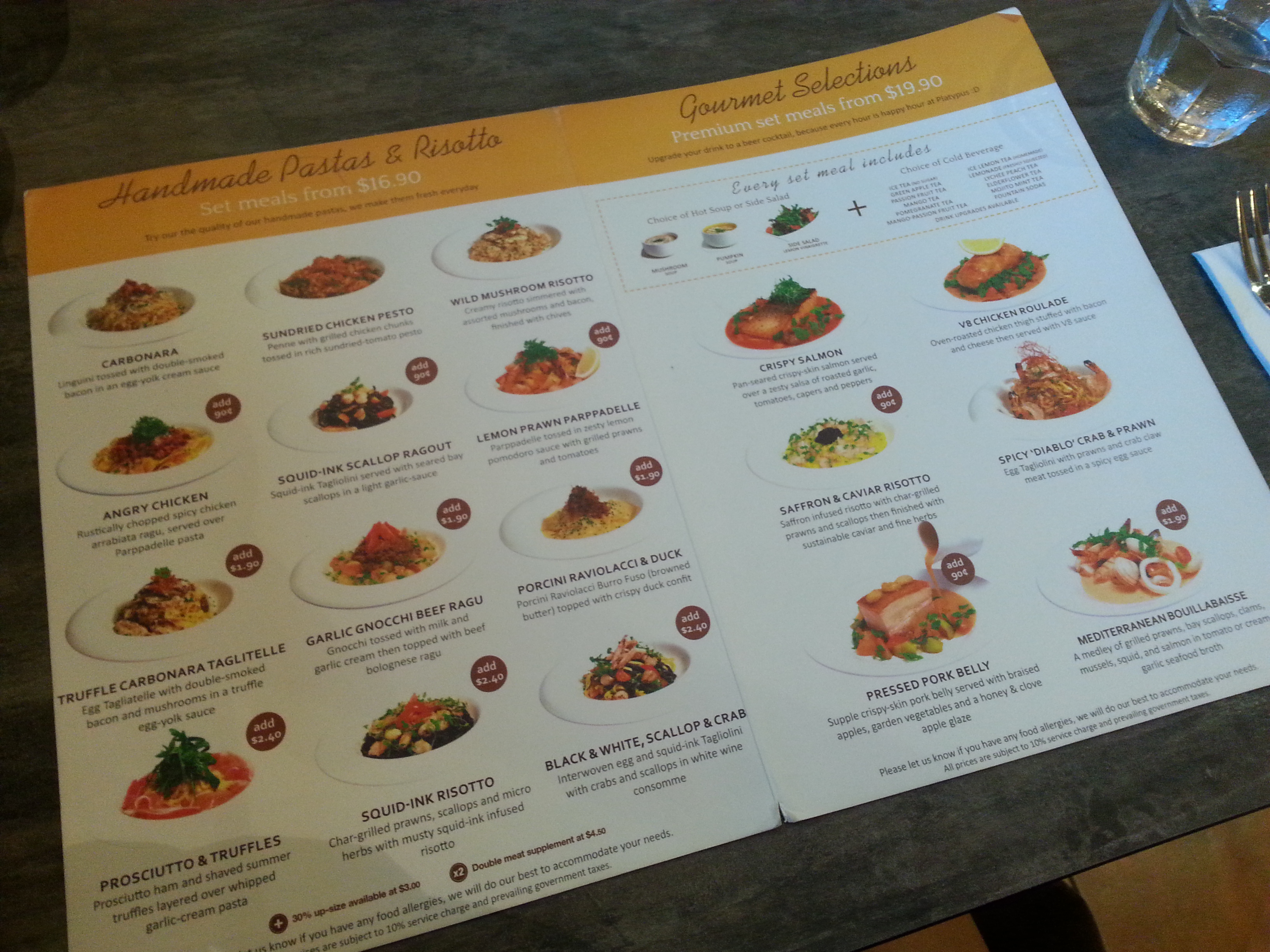 it was definitely affordable, with a set menu (for both lunch & dinner!) starting from $16.90 that included a choice of starter (pumpkin soup, mushroom soup or salad), a pasta (an additional $1-$2+ was added for certain more “gourmet” pastas) and a drink (a whole range of exciting-sounding but not so exciting-tasting options):