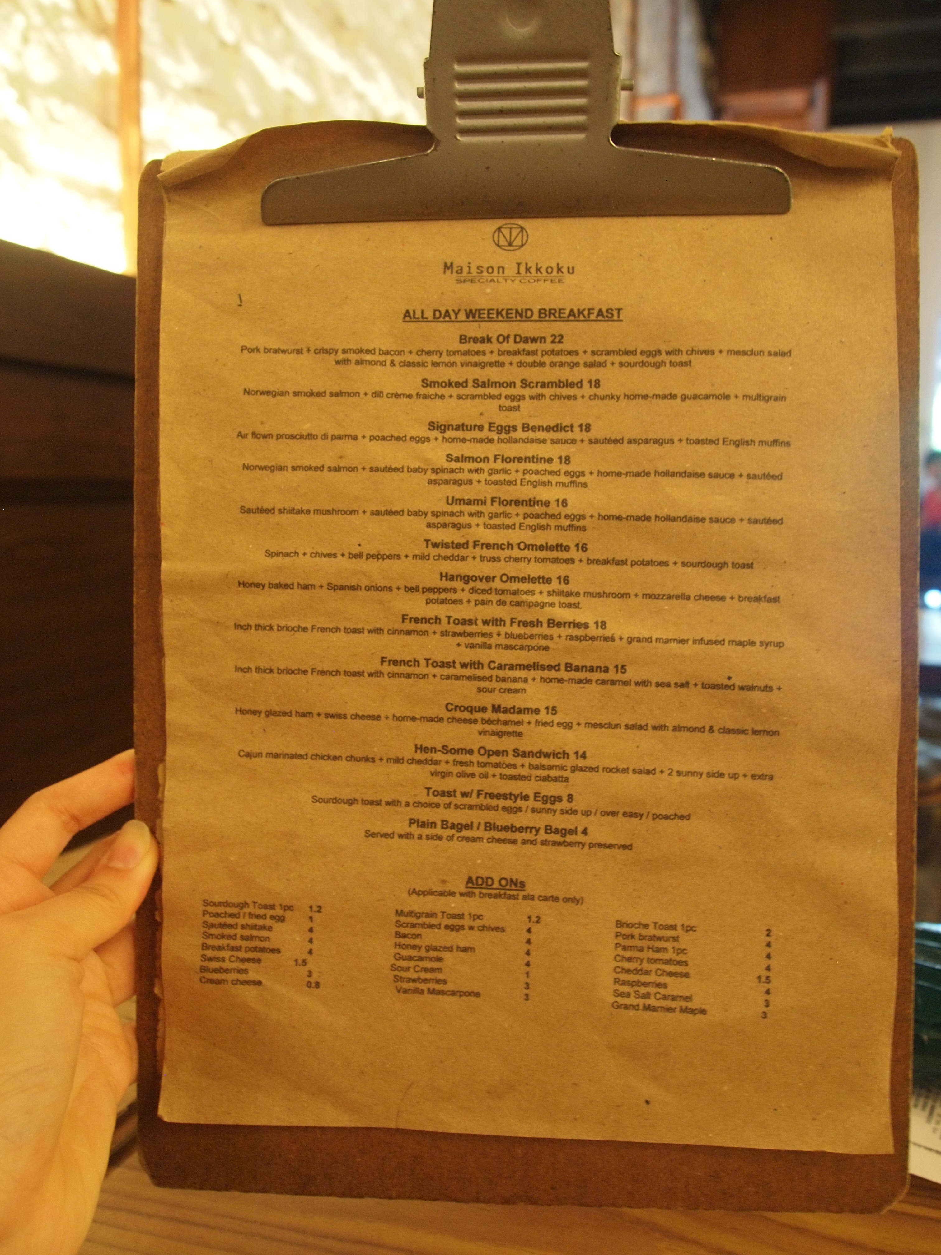 on weekdays, they only serve a limited range of breakfast items, and for a short 2 hours from 9am-11am (their weekday menu can be found on their website at http://www.maison-ikkoku.net/). if getting up before 10am and making your way to kandahar street proves to be a bit of a challenge for the more sleep-inclined among you, then besides the fact that its probably a lot more crowded on weekends, heading over on a saturday or sunday instead is a great alternative! the weekend menu is extensive and has an exciting range of all day breakfast items to choose from, which i love!