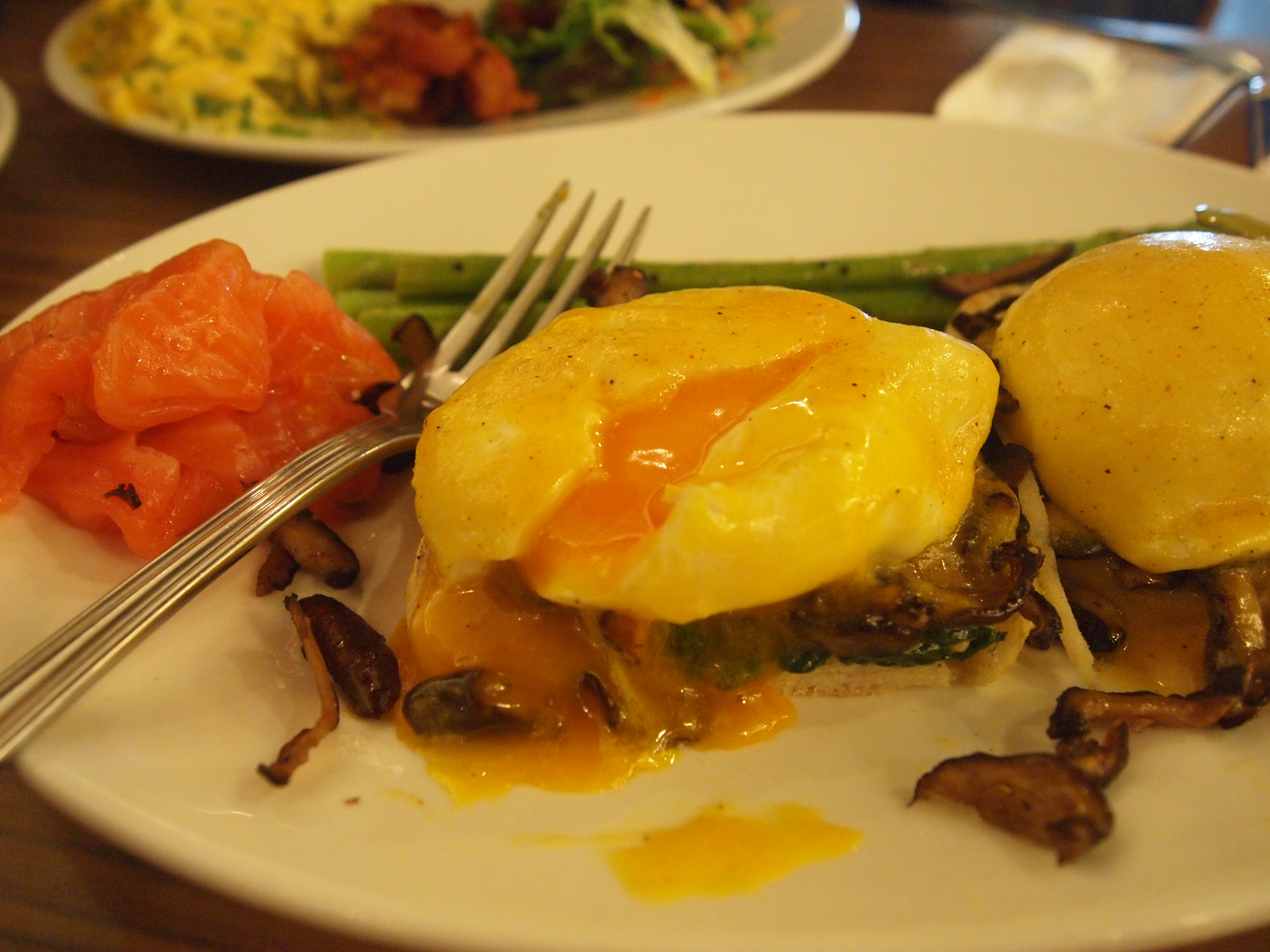 the first thing we got was the umami florentine – sauteed shiitake mushrooms + sauteed baby spinach with garlic + poached eggs + hollandaise sauce + sauteed asparagus + toasted english muffins! we also added smoked salmon on the side.