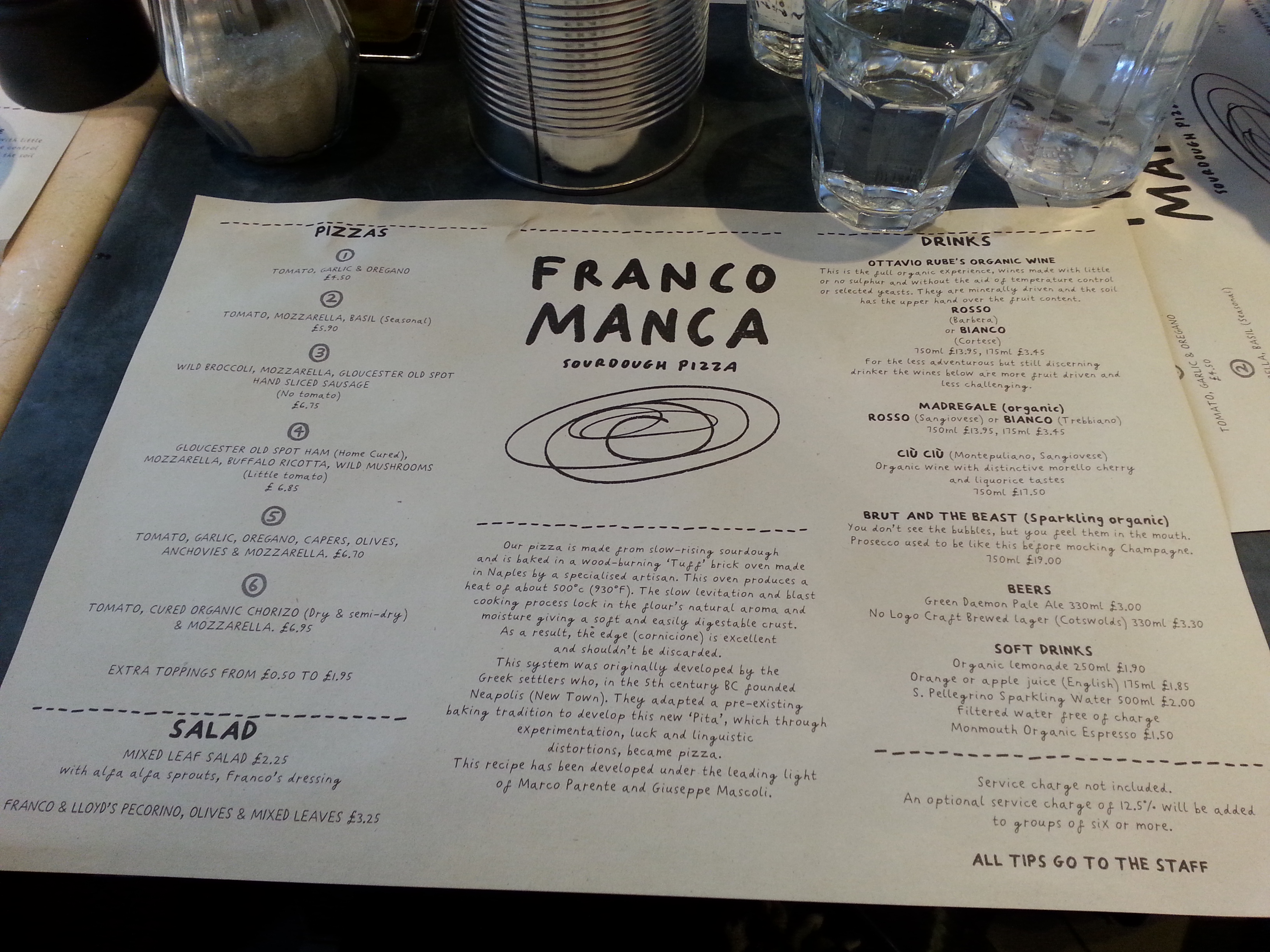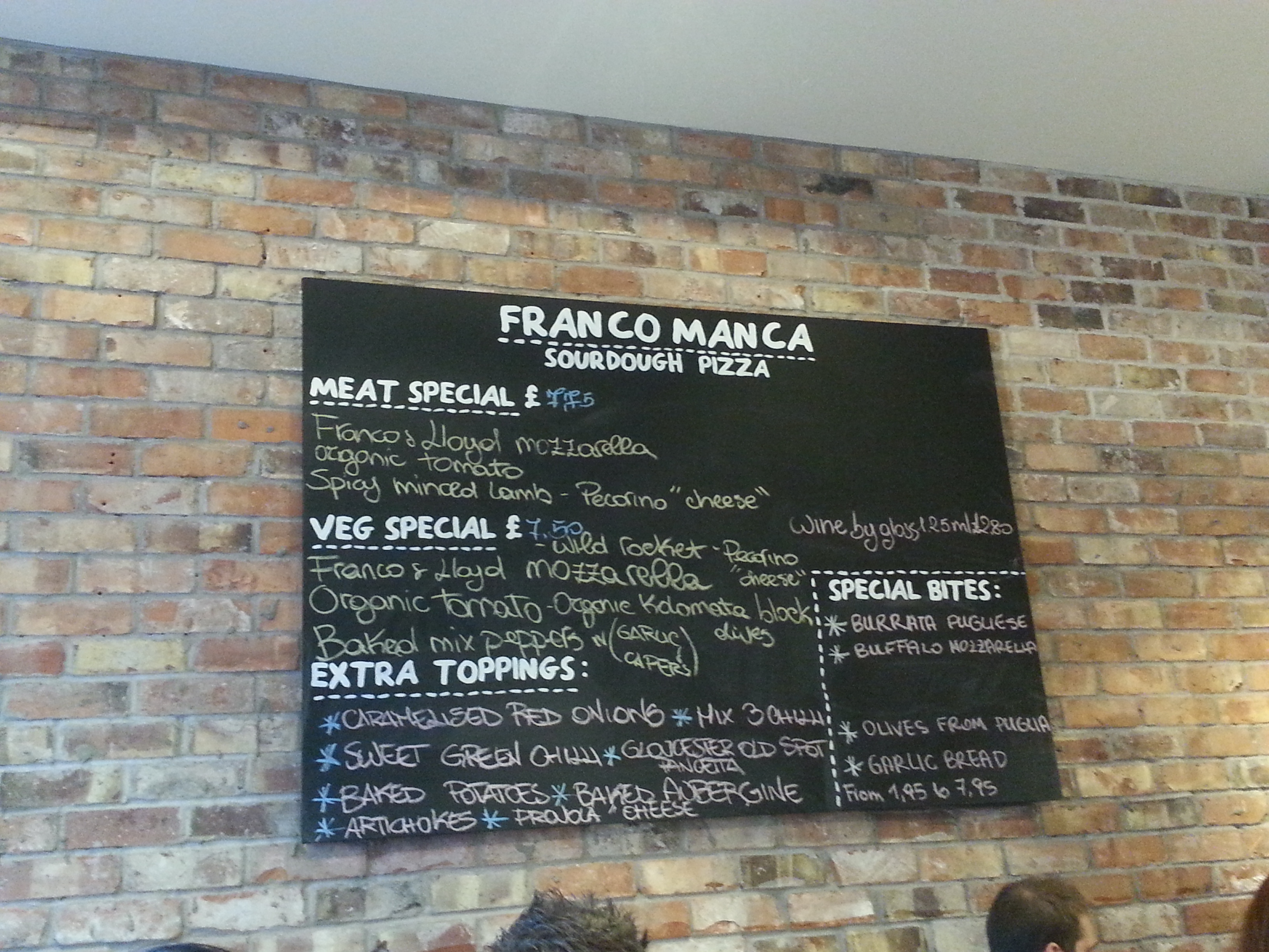 i had heard it was good, but got even more excited when i saw some reviews they had selected to put on their menu – people were really singing praises about it! “if you only eat one pizza this year, make sure it’s franco manca” – tatler. they were also dubbed the “best in britain” by the observer! seeing all that really made me take my first bite of the pizza with high expectations, and i am pleased to say that they were certainly met 😀 also, i was actually pretty full that day having had a really big breakfast, so the fact that i still thought it tasted really good probably means it really did 😉