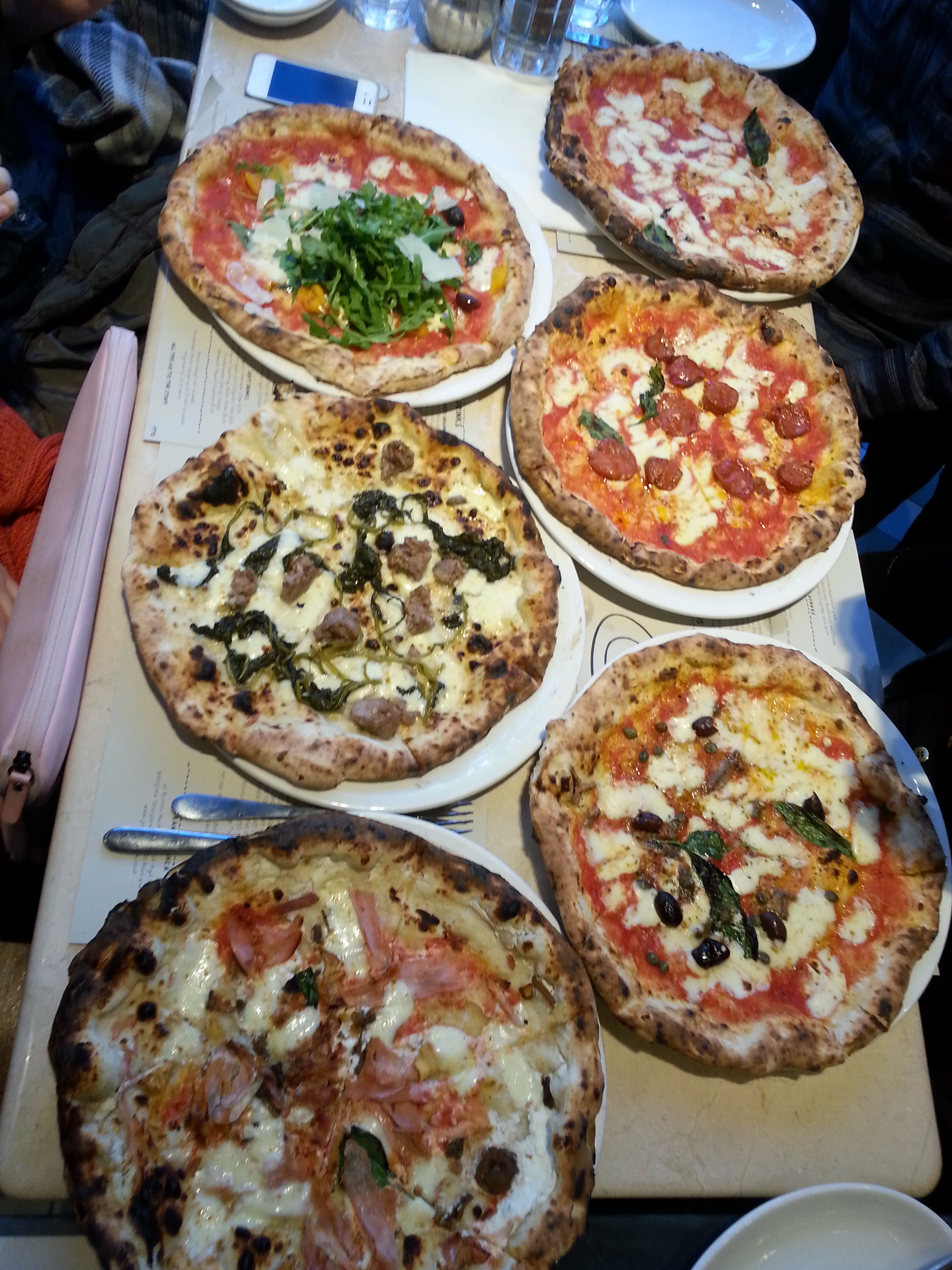 we went as a group of 7 which allowed us to order a range of pizzas to try – we ordered 1 of everything on the menu except the most basic tomato, garlic & oregano, which we replaced with the veggie special of the day. it was all very exciting 😉