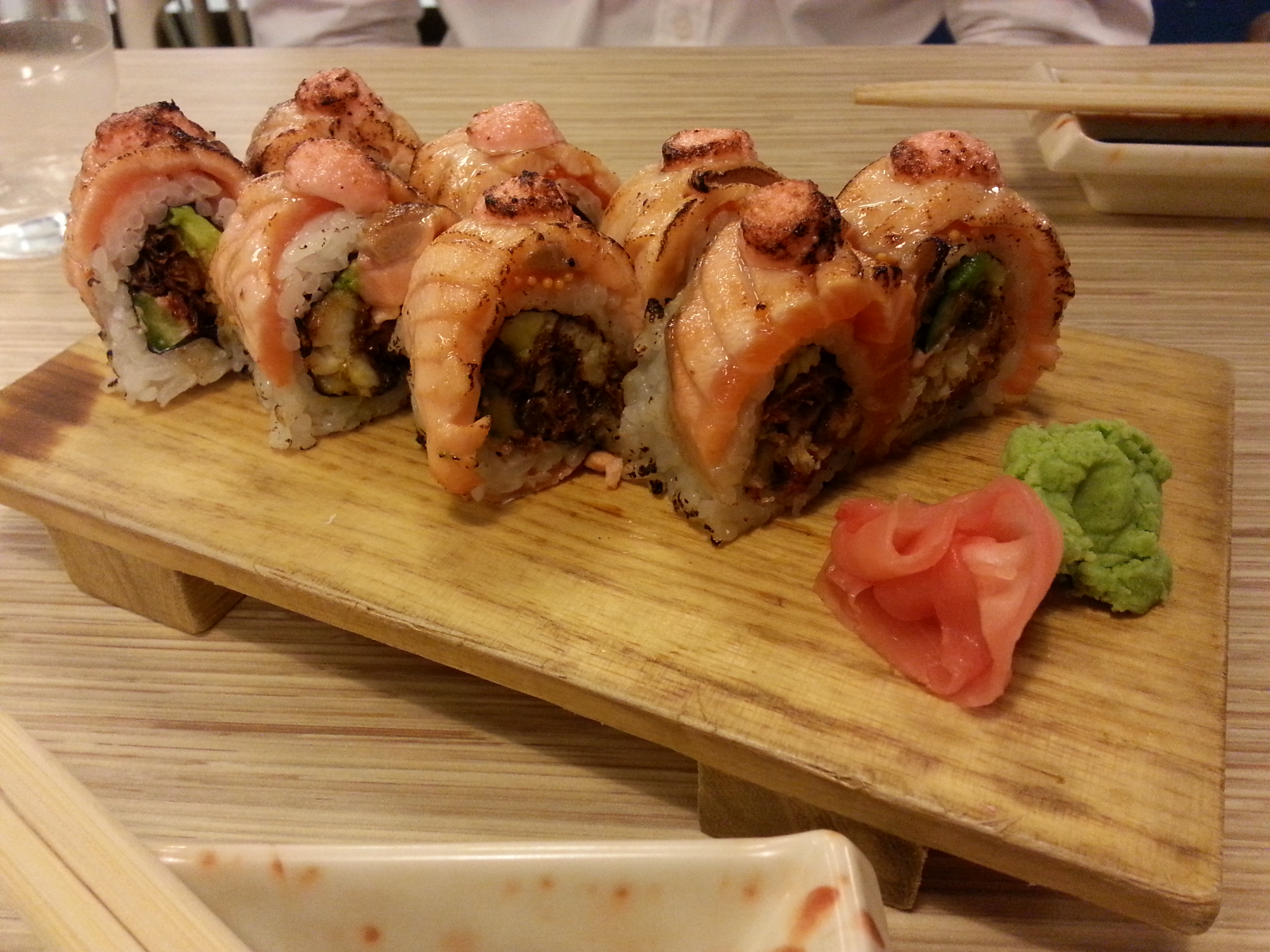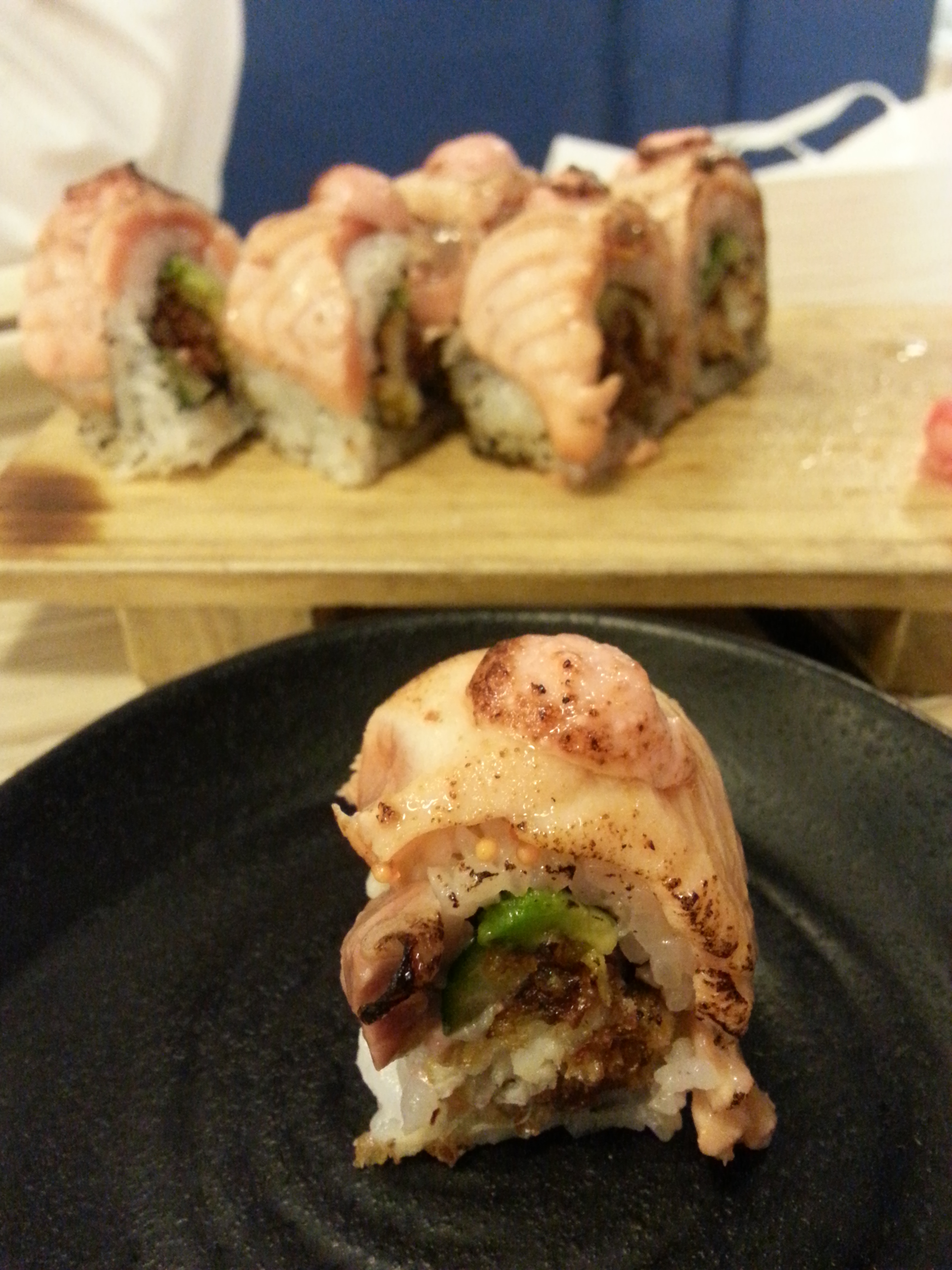 we all really enjoyed this! they have normal aburi salmon maki too, but this one with soft shell crab was recommended by a friend so this is what we tried! i must say sushi bar does their aburi salmon very well – torched just enough to cook a thin top layer of the otherwise raw salmon, it gives the generous pieces that hug the rolls an almost melt-in-your-mouth effect. the rolls are stuffed with perfectly ripe avocado and soft shell crab that was fried nicely and most importantly in fresh oil.