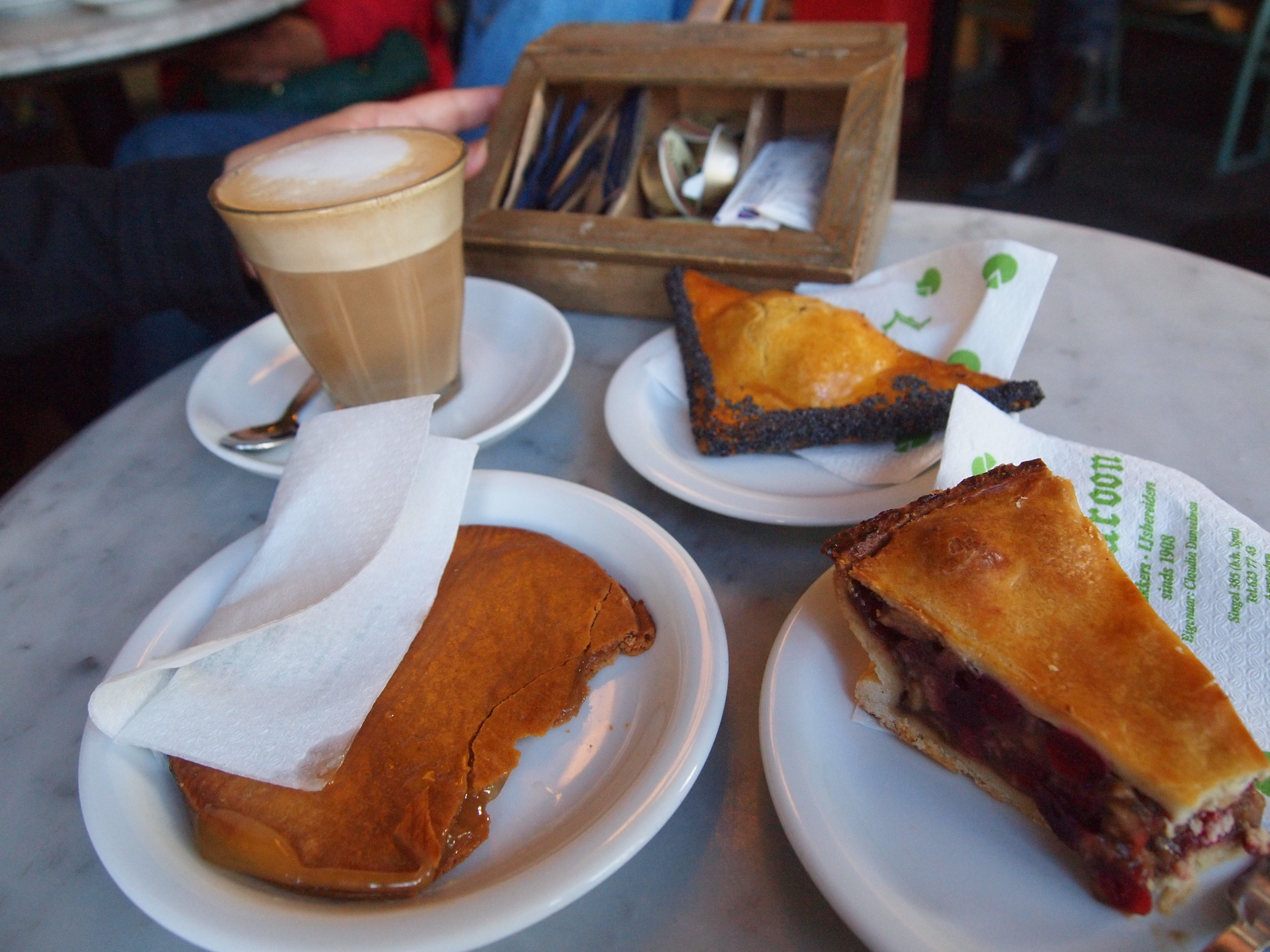 on our first visit there (yes we visited multiple times during the course of our 4 day trip), we tried their specialty the honey stroopwafel (they also do a coffee one which my mother preferred), an orange and poppy seed biscuit, and a slice of their apple-cranberry pie.