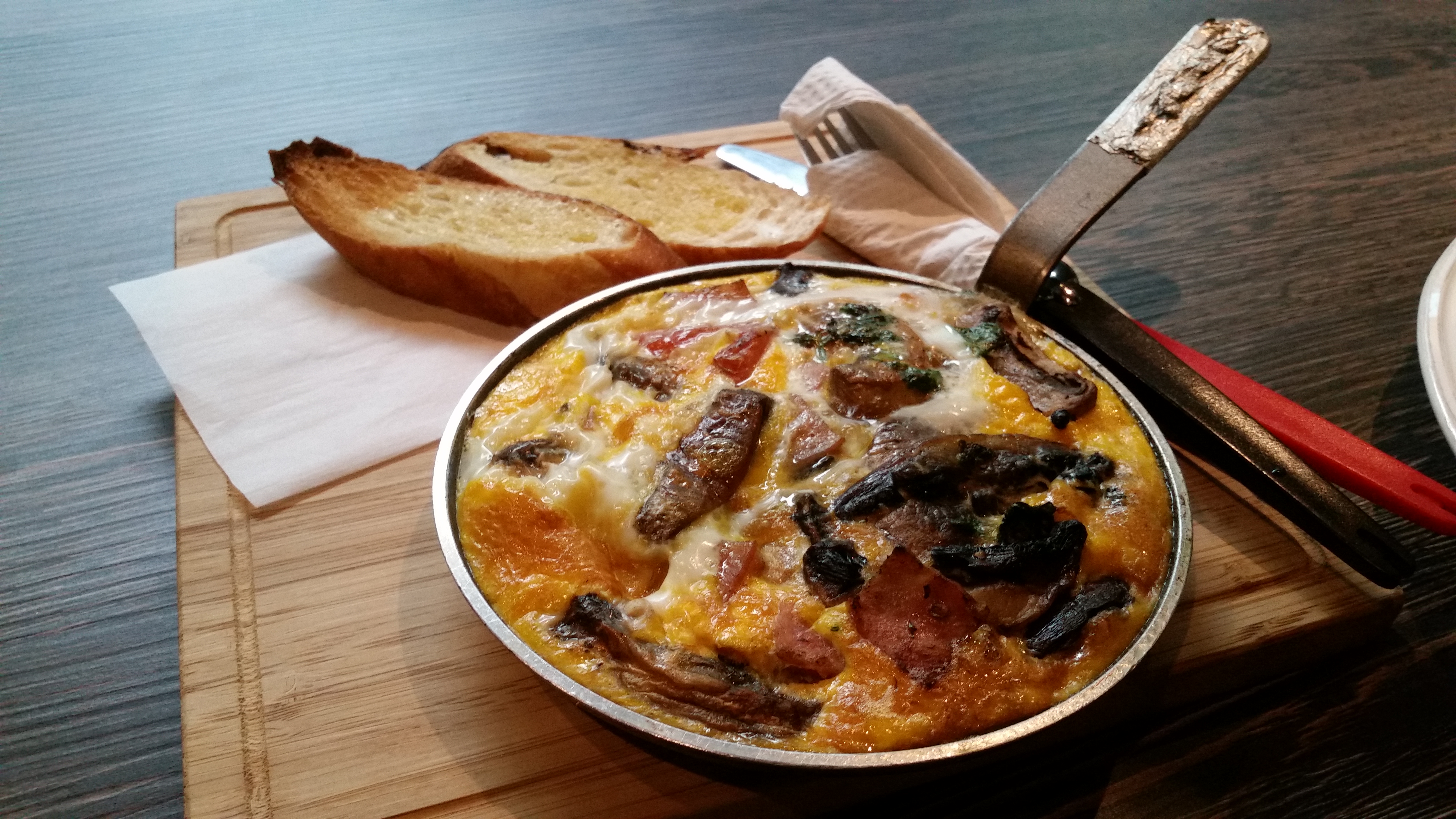 mushroom frittata – italian mushroom omelette with ham, mushroom, tomato & cheese served with sourdough ($12)