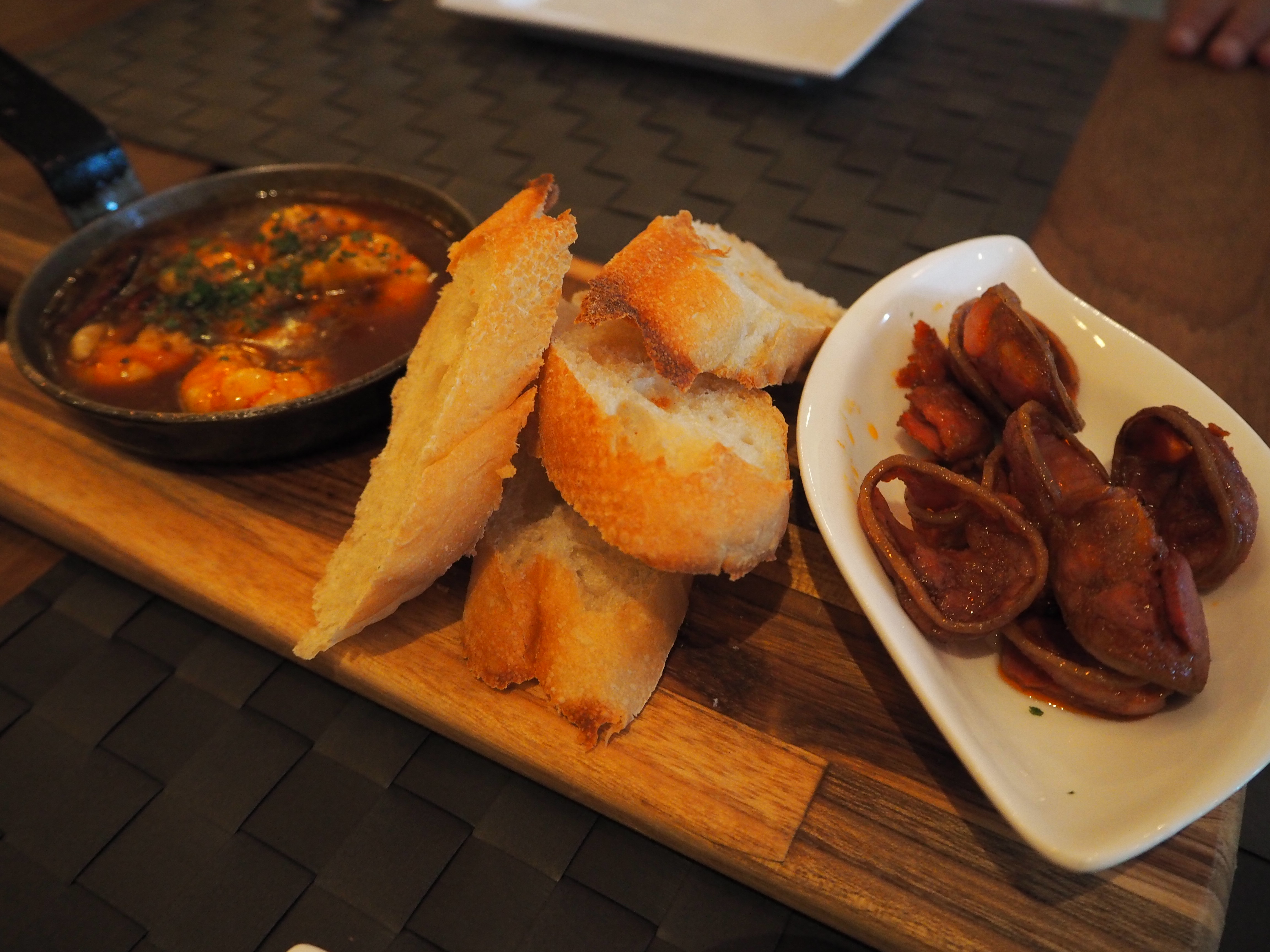 next, we were served 2 tapas on a board – the garlic prawns (left) and fried chorizo (right):