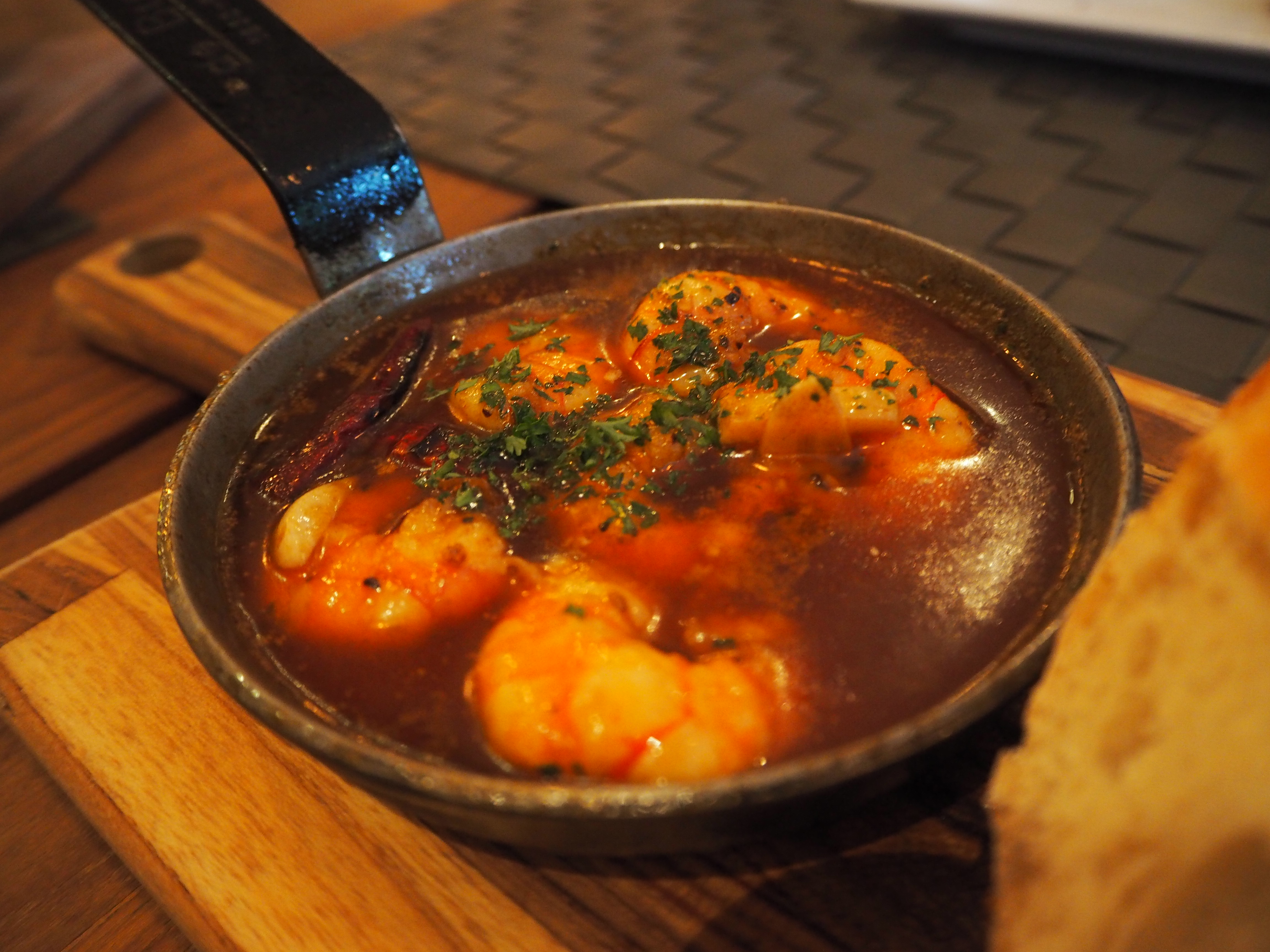 gambas al ajillo (garlic prawns) – fresh shrimp cooked in boiling olive oil with garlic and chilli pepper $16