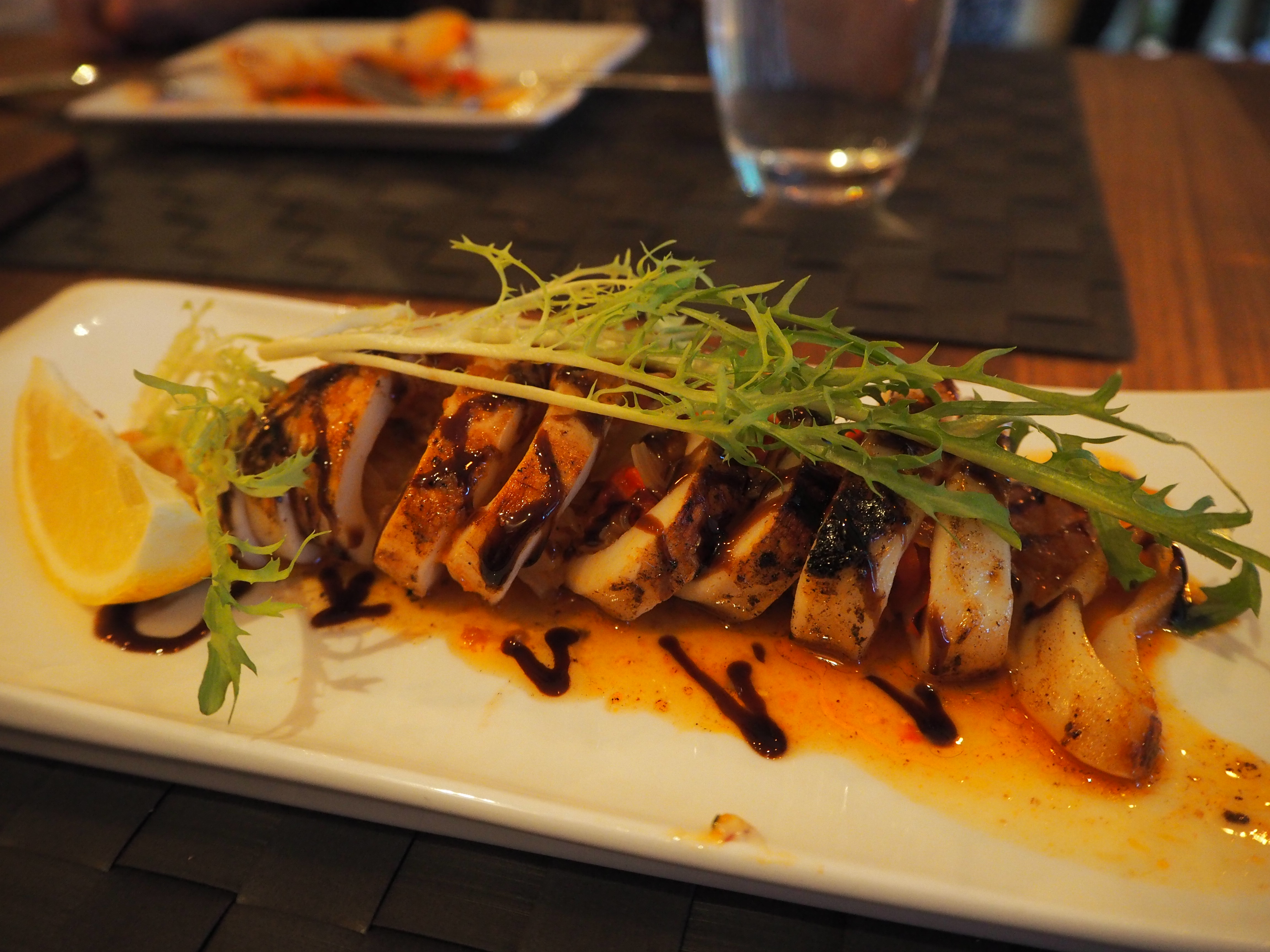 calamares rellenos a la plancha con cebolla y pimientos – whole grilled squid stuffed with caramelised onions and red peppers, grilled and drizzled with a sherry wine reduction $21 close-up of the stuffing: