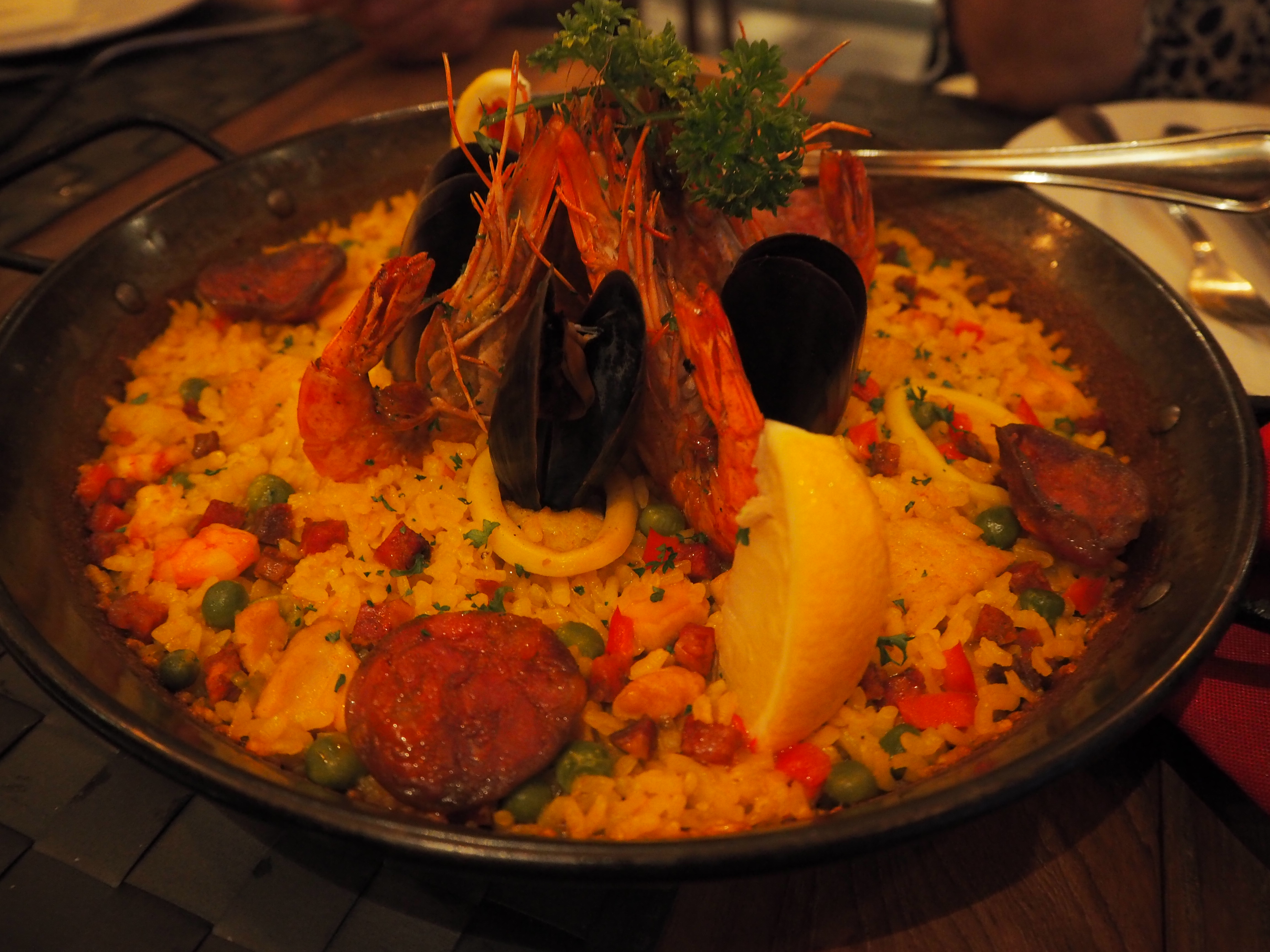 i really enjoyed this dish. it was a generous serving that is great for sharing, and the squid was fresh and grilled wonderfully. it retained the right amount of crunchiness and had a perfect subtly charred taste that was balanced by the sweetness of the caramelised onions and red peppers. the sherry wine reduction was very tasty and squeezing some lemon juice to go along with it lifted its taste, and kept it light and refreshing. finally we were on to the paellas, which take 40-45 minutes to cook because they are made to order. we were told that each small pan serves 2-3 people, but upon seeing the serving size, i think its pretty generous and can probably serve 3-4 people especially if you have other food. for the 5 of us, we decided to go with ordering 2 different small paellas rather than 1 medium-sized paella. the first paella that we ordered was the house paella: