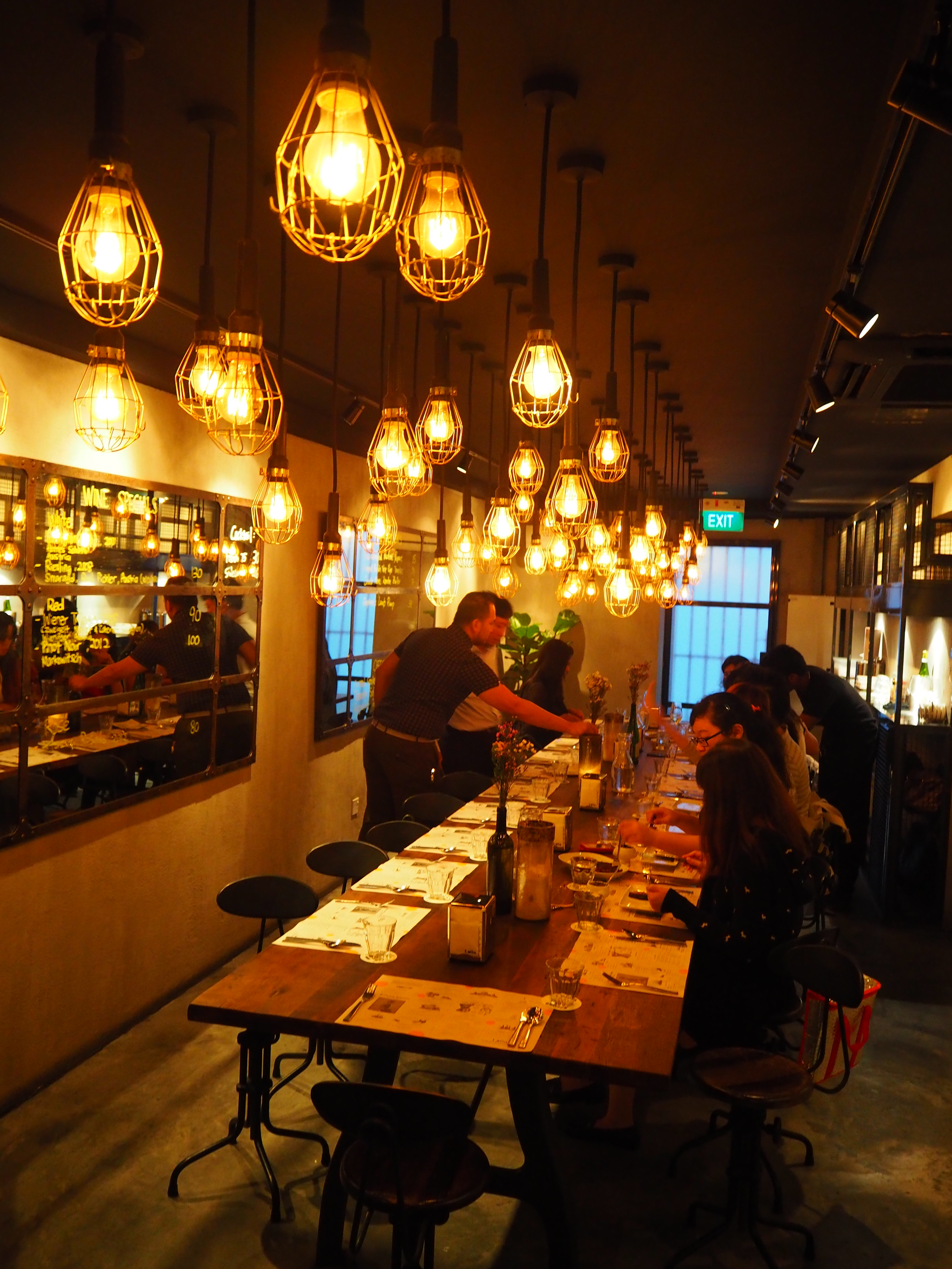located at the hiving-by-night ann siang hill, lolla is a mediterranean-inspired tapas-style restaurant that serves a range of what struck me as fusion-type small plates meant for sharing in a group. it occupies the ground and basement levels of a shophouse – the ground floor houses a long counter where guests can watch the chefs at work while the basement is home to a communal table. would have loved to be in on the action at the counter but we were told when we called to make a reservation that the counter was for walk-in customers only (i wasn’t particularly pleased to hear that, to be honest… shouldn’t those who make reservations get first pick of where they sit?). the place is trendily decorated to exude a casual and fun yet stylish vibe, and the restaurant was already buzzing when we arrived slightly past 7.
