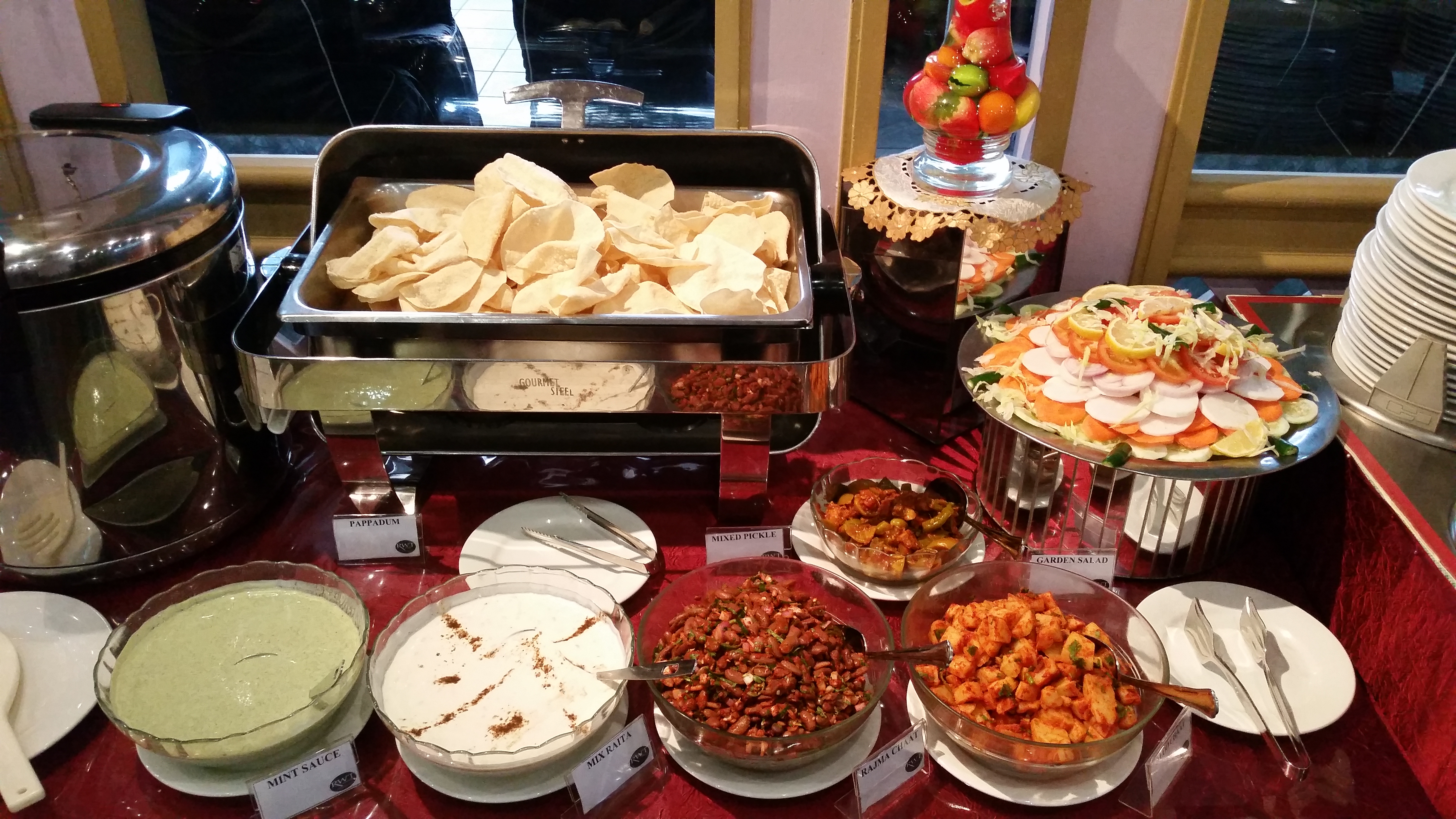 the buffet spread consisted of 8 main dishes (3 meats 1 fish and 4 veg), briyani, white rice, soup, a section with pickles + mint sauce + raita (indian yoghurt) + papadum etc, and dessert – quite a spread for the price you pay, we thought!