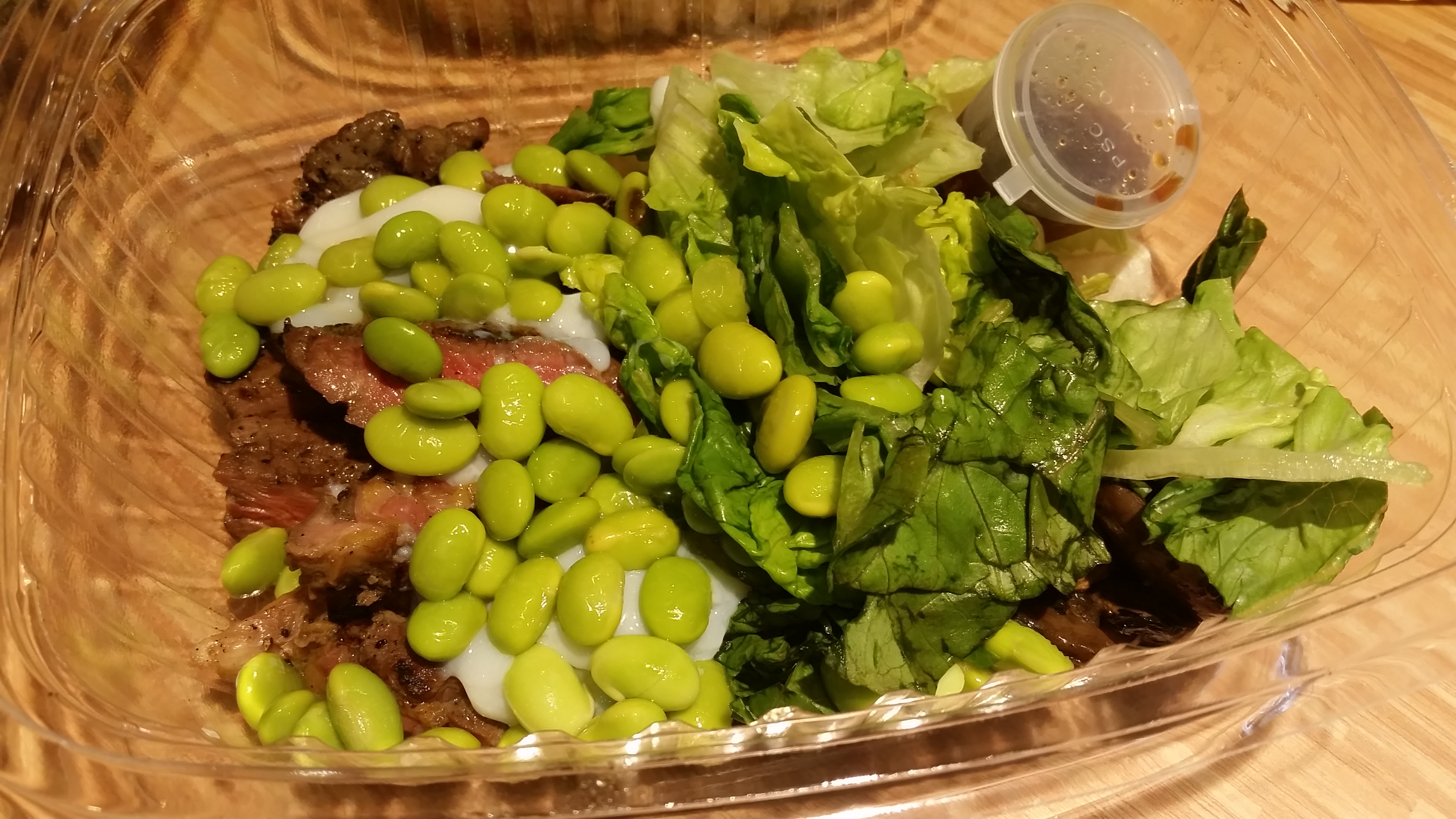 sirloin steak + romaine lettuce + edamame + sous vide egg + mushrooms (ginger ponzu dressing)