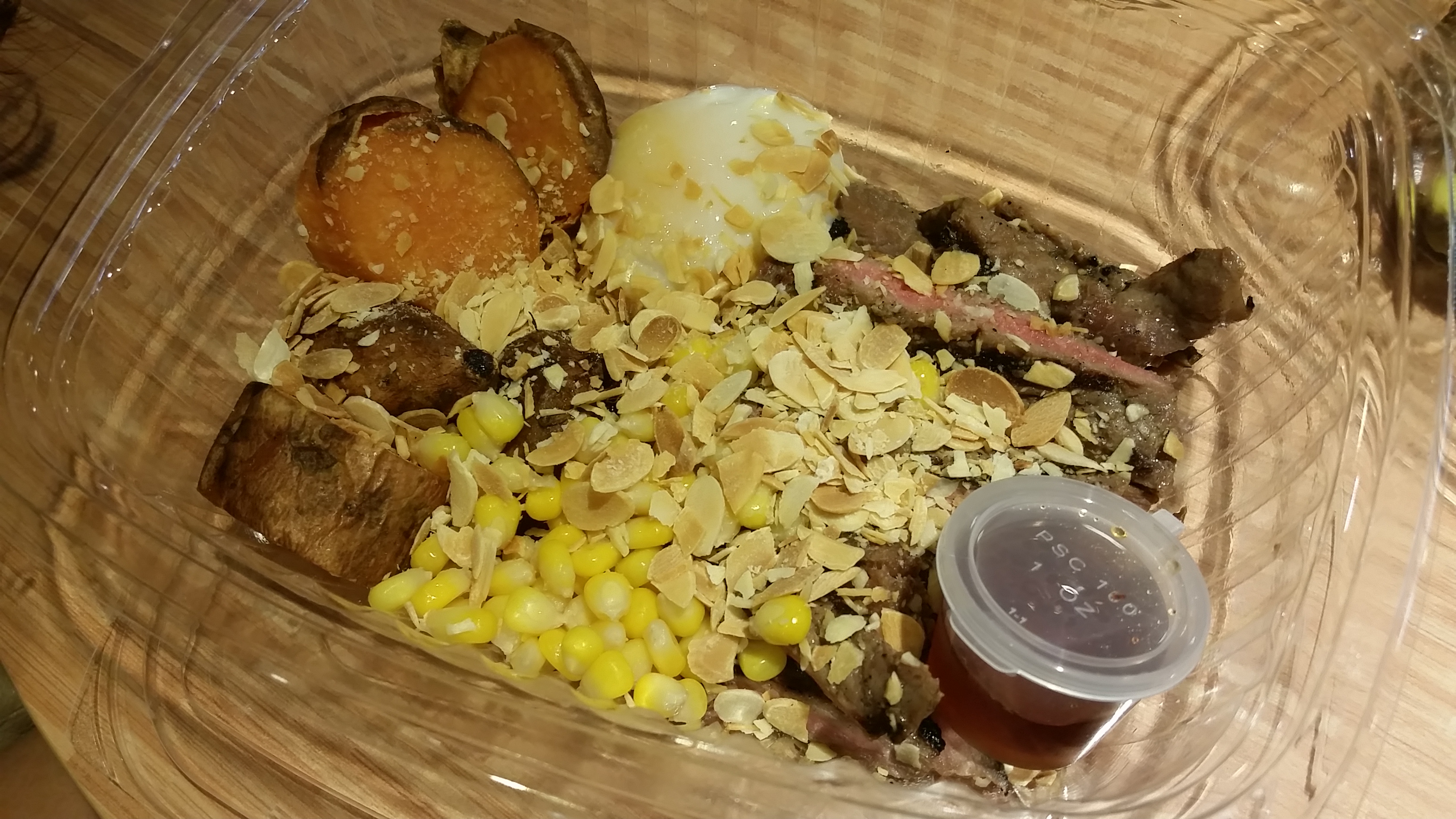 sirloin steak + sweet potato + sweet corn + almonds + sous vide egg (thai dressing)