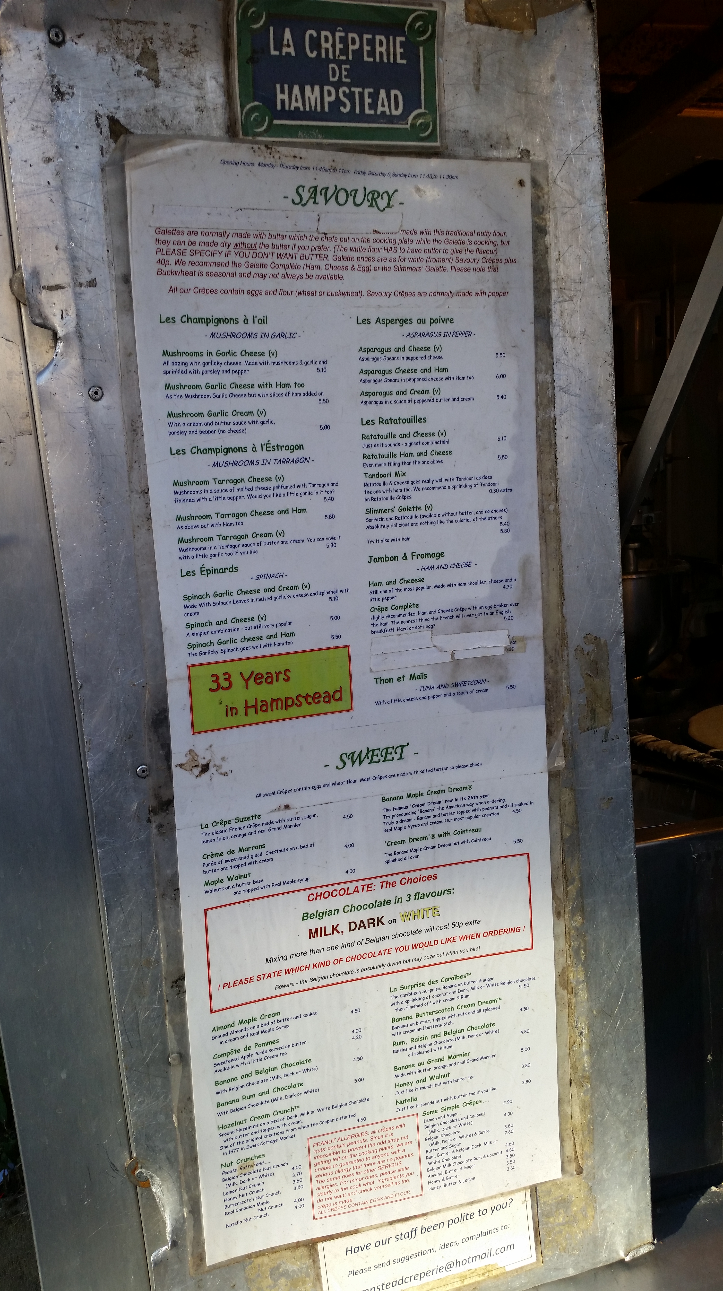 we visited for a late lunch (about 2pm) on a saturday afternoon, and i could smell the wonderfully tantalising aroma of fresh crepes as i approached this hampstead institution. there was a surprisingly short line of about 8 people ahead of us, and it varied in length throughout the time we were there, but at no point did it become unmanageable. the menu is so extensive that (if you’re as indecisive/greedy as i am) you’ll probably spend half (or more) of the waiting time just considering what crepe to get anyway: