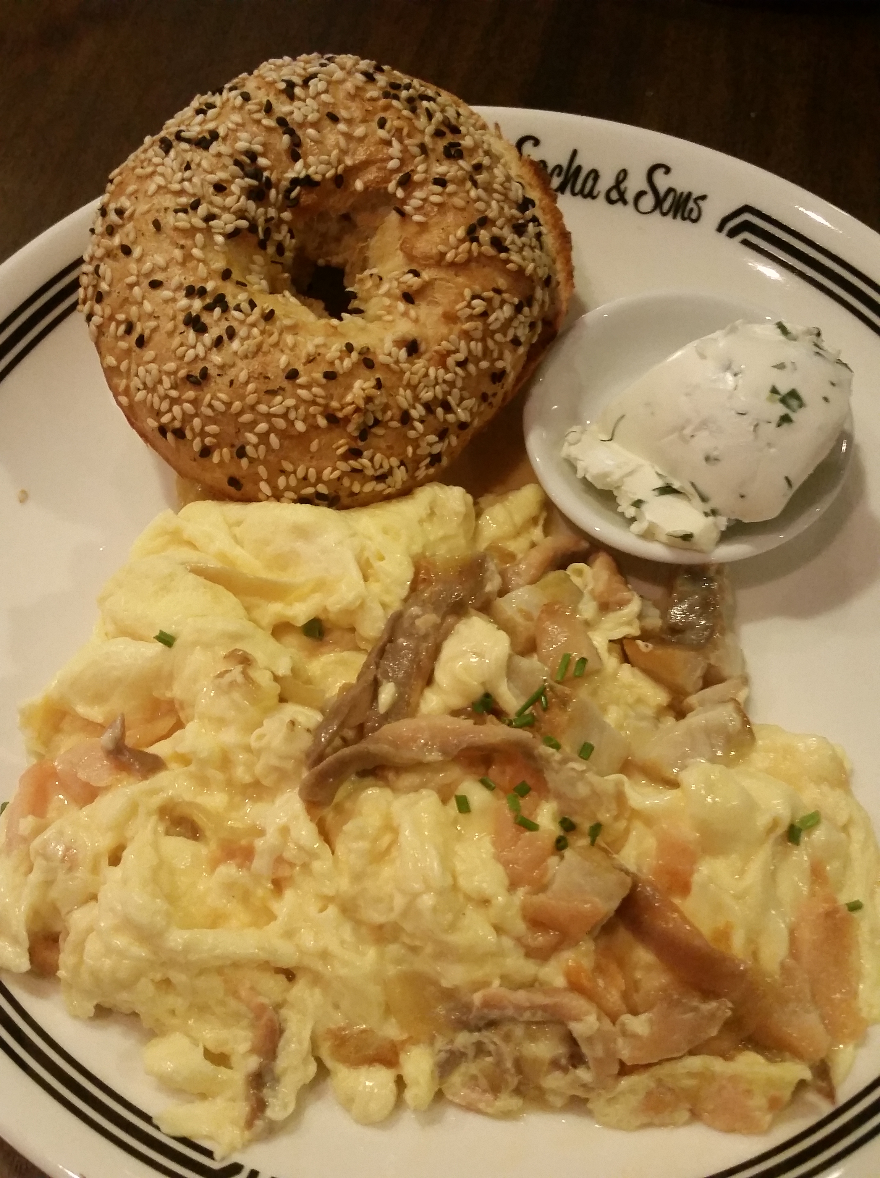 scrambled eggs with sturgeon, smoked salmon and caramelised onions served with a toasted bagel and cream cheese with herbs – $18