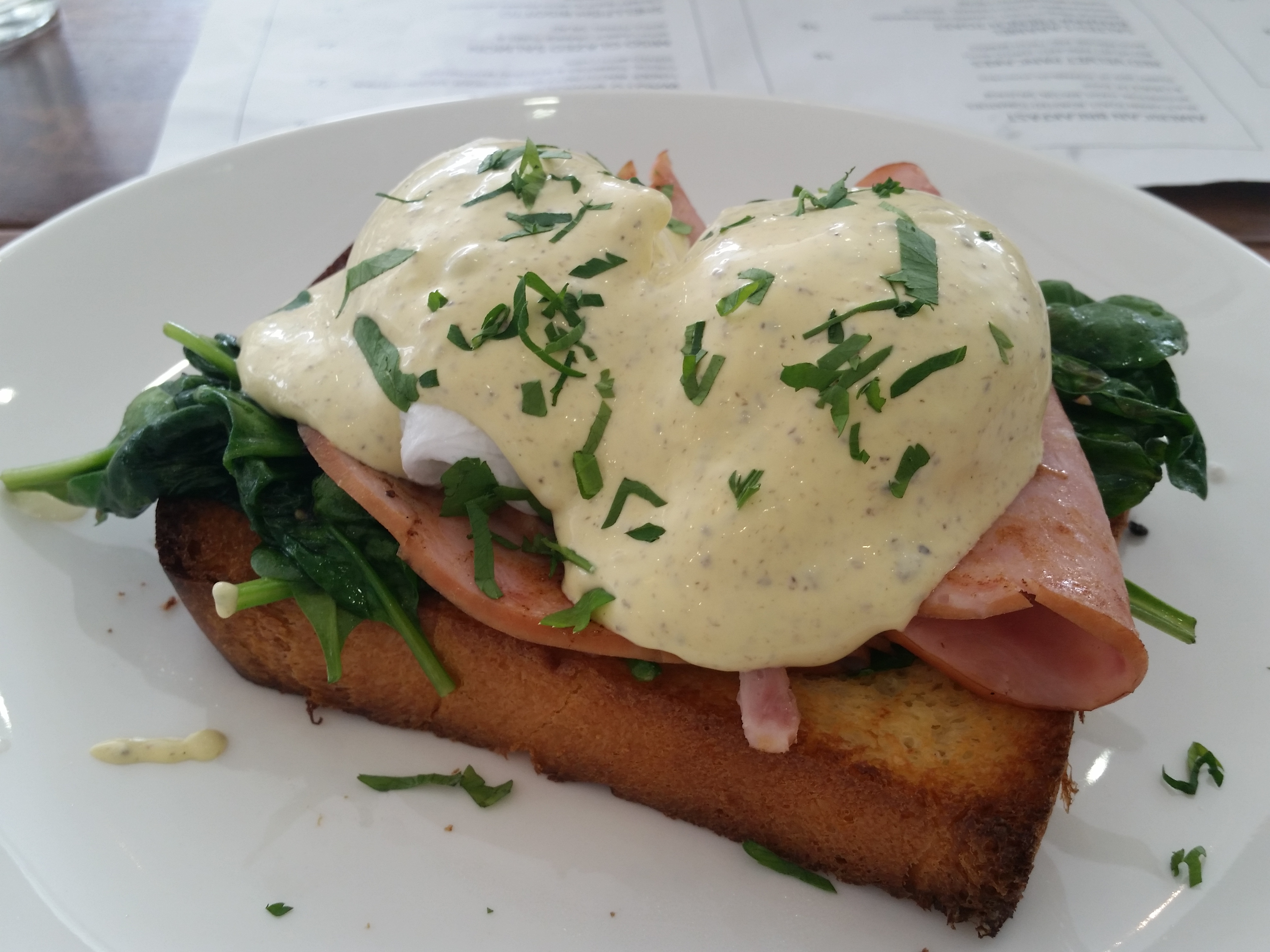truffle benedict – brioche, smoked ham, wilted spinach, free range poached eggs served with truffle hollandaise sauce ($18)