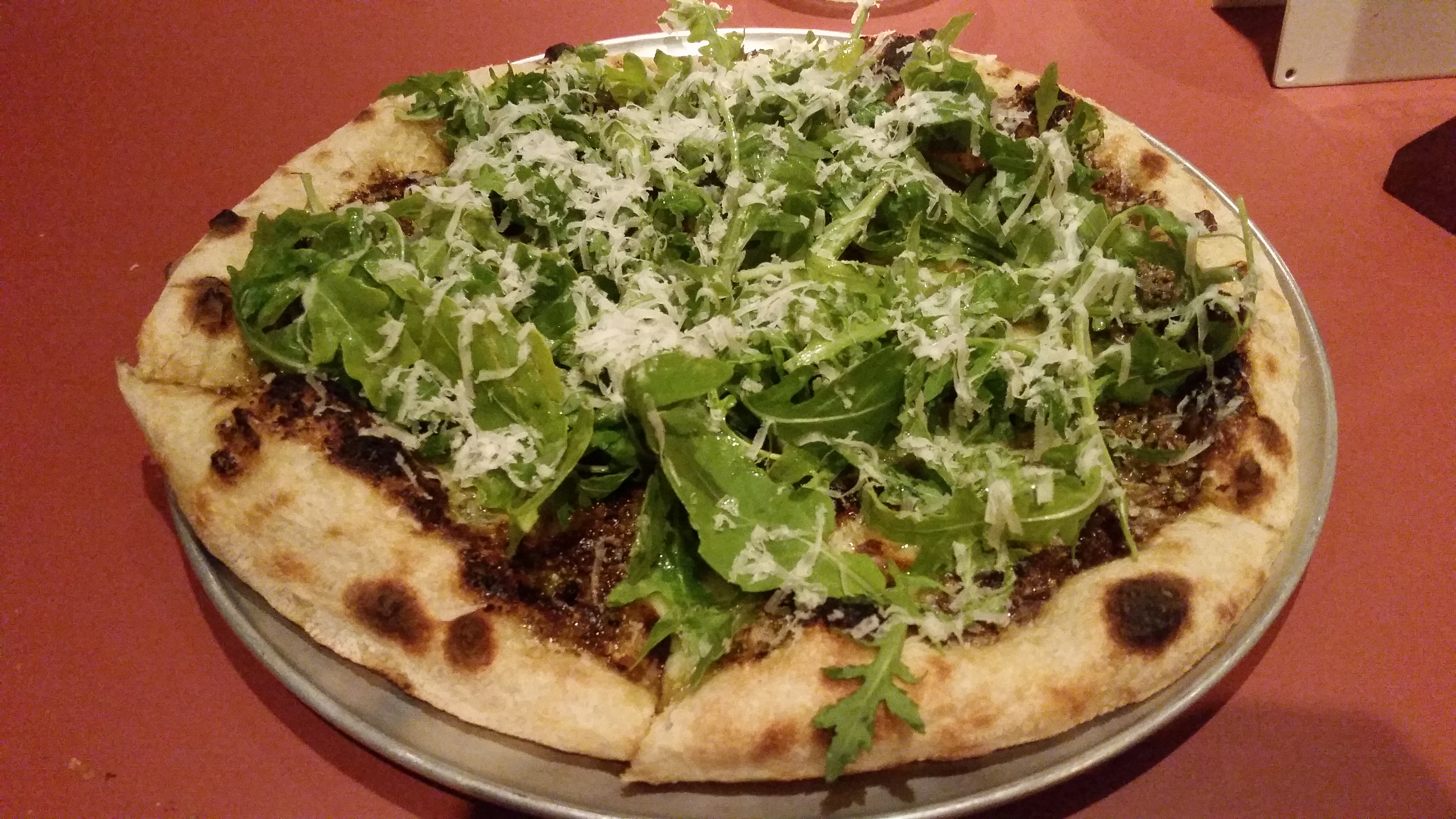 we hadn’t intended on getting pizza initially, but after spying people feasting on drool-inducing doughy goodness, we could not resist and ended up ordering a smoked mozarella and pancetta pizza (their special for the day – £7).