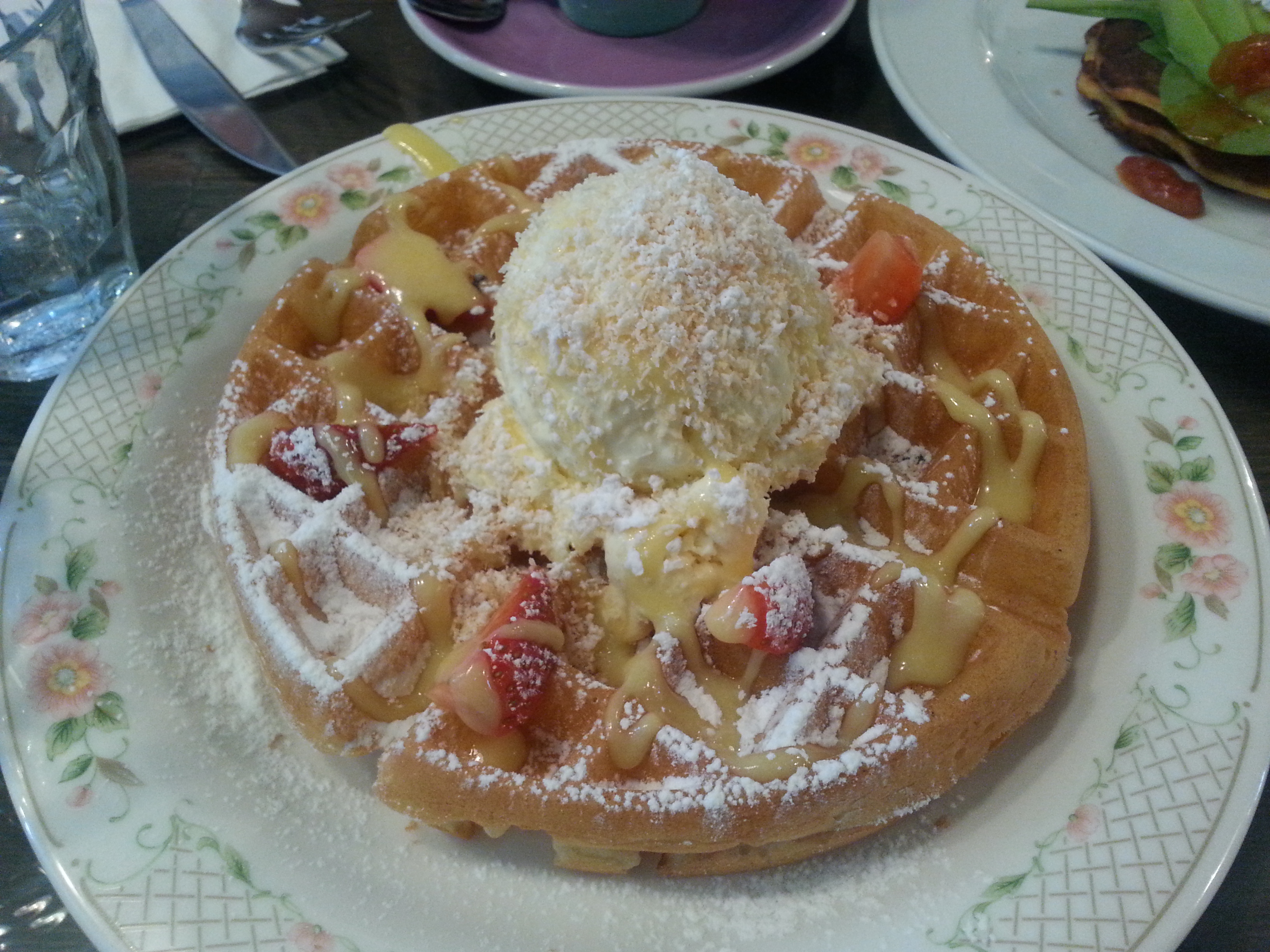 it was overall a pretty good experience at strangers’ reunion in a nice environment with good service. i would return to strangers’ reunion for their buttermilk waffles (though there are other amazing waffle options at creamier (belgian waffles) or DOC, but probably not for any proper food (though they do serve some more substantial lunch/dinner options) – i thought the food wasn’t anything to shout about at all (besides the waffle) though; even the eggs that several other diners were ordering didn’t look great but i’m not sure how they tasted – i do think they need to work on their presentation! we weren’t particularly full after what we had since the servings were rather small, but nothing was calling out to us from the desserts menu or cake display so we passed on that too (shocking, i know :O hahaha).  i’m happy that i finally checked this place out, but it was all a little overrated, i feel!